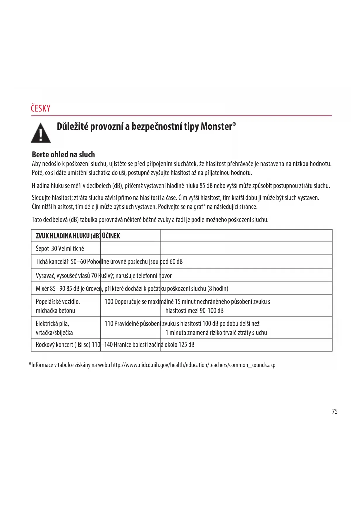74Berte ohled na sluch Aby nedošlo k poškození sluchu, ujistěte se před připojením sluchátek, že hlasitost přehrávače je nastavena na nízkou hodnotu. Poté, co si dáte umístění sluchátka do uší, postupně zvyšujte hlasitost až na přijatelnou hodnotu. Hladina hluku se měří v decibelech (dB), přičemž vystavení hladině hluku 85 dB nebo vyšší může způsobit postupnou ztrátu sluchu. Sledujte hlasitost; ztráta sluchu závisí přímo na hlasitosti a čase. Čím vyšší hlasitost, tím kratší dobu jí může být sluch vystaven. Čím nižší hlasitost, tím déle jí může být sluch vystaven. Podívejte se na graf* na následující stránce. Tato decibelová (dB) tabulka porovnává některé běžné zvuky a řadí je podle možného poškození sluchu. ZVUK HLADINA HLUKU (dB) ÚČINEK Šepot 30 Velmi tiché Tichá kancelář 50–60 Pohodlné úrovně poslechu jsou pod 60 dB Vysavač, vysoušeč vlasů 70 Rušivý; narušuje telefonní hovor Mixér 85–90 85 dB je úroveň, při které dochází k počátku poškození sluchu (8 hodin) Popelářské vozidlo, míchačka betonu 100 Doporučuje se maximálně 15 minut nechráněného působení zvuku s hlasitostí mezi 90-100 dB Elektrická pila, vrtačka/sbíječka 110 Pravidelné působení zvuku s hlasitostí 100 dB po dobu delší než 1 minuta znamená riziko trvalé ztráty sluchu Rockový koncert (liší se) 110–140 Hranice bolesti začíná okolo 125 dB *Informace v tabulce získány na webu http://www.nidcd.nih.gov/health/education/teachers/common_sounds.asp Důležité provozní a bezpečnostní tipy Monster® ČESKY 75„… typický člověk může bezpečně poslouchat iPod 4,6 hodiny za den na 70 % hlasitosti.“ „… znalost úrovně hlasitosti poslechu hudby a délka doby poslechu je velmi důležitá.“ Z webu http://www.cbc.ca/health/story/2006/10/19/music-earphones.html Získejte co nejvíce z vašeho zařízení a vychutnejte si skvělé zvukové vlastnosti i při bezpečných hladinách zvuku. Naše sluchátka vám umožní slyšet více detailů při nižší hlasitosti než kdy předtím. Fyziologie ucha a sluchu Další informace o účincích hluku na lidský sluch najdete na http://www.abelard.org/hear/hear.php#loud-music Kladívko Předsíňohlemýžďový nerv Třmínek Bubínek Zvukovod Hlemýžď Malá kůstka ve středním Vchod K nosu, hrdlu uchu ČESKY 76Poslech Před nasazením sluchátek N-tune snižte nastavení hlasitosti na přehrávacím zařízení. Označení „L“ a „R“ na vnitřní straně sluchátek určují stereofonní kanál. Sluchátko „L“ je na levé ucho. Sluchátko „R“ je na pravé ucho. Připojejní, mluvení a ovládání Kabel sluchátek N-tune® má zabudovaný ovladač Monster ControlTalk Universal® pro poslech hudby z telefonu nebo novějšího modelu iPod®/iPad®. Jedno ovládací tlačítko a zabudovaný mikrofon umožňují snadné přepínání mezi poslechem hudby a telefonováním bez použití rukou. Používání ovladače ControlTalk Universal™ Přijetí hovoru: Když je oznámen příchozí hovor, stiskněte a uvolněte ovládací tlačítko na ControlTalk Universal. Ukončení hovoru: U většiny telefonů stiskněte a uvolněte ovládací tlačítko. U některých telefonů je potřeba ovládací tlačítko stisknout a podržet. Funkce čekajícího hovoru: Mnoho telefonů, ale ne všechny, pracuje následovně: Při upozornění na příchozí hovor během již probíhajícího hovoru lze přijmout nový hovor a nechat původní hovor čekat stisknutím a uvolněním ovládacího tlačítka. Další stisk a uvolnění ovládacího tlačítka přepne zpět na první hovor. Stisk a podržení ovládacího tlačítka ukončí aktuální hovor a přepne na doposud čekající hovor. Universal ČESKY 77Údržba a skladování Bezpečné a hygienické používání sluchátek N-tune vyžaduje jejich udržování v čistotě. Nedávejte sluchátka do uší, pokud nejsou čistá. Sluchátka N-tune ukládejte vždy do čistého a suchého prostředí. Neskladujte za výrazně vysokých či nízkých teplot. Nevystavujte kapalinám, extrémním teplotám a vlhkosti. Neodpojujte konektor sluchátek N-tune od zařízení tahem za kabel. Uchopte zástrčku na konci kabelu a tahem odpojit. Sound Check Optimální kvalitu poslechu na zařízeních iPod® a iPhone® zajišťuje funkce Sound Check v aplikaci iTunes®. Funkce Sound Check normalizuje hlasitost všech skladeb v knihovně uživatele. Sluchátka N-tune jsou speciálně upravena k zajištění hlasitého, ale současně bezpečného poslechu při aktivní funkci Sound Check. Více se o funkci Sound Check v aplikaci iTunes dočtete na http://docs.info.apple.com/article.html?artnum=61655. Ano