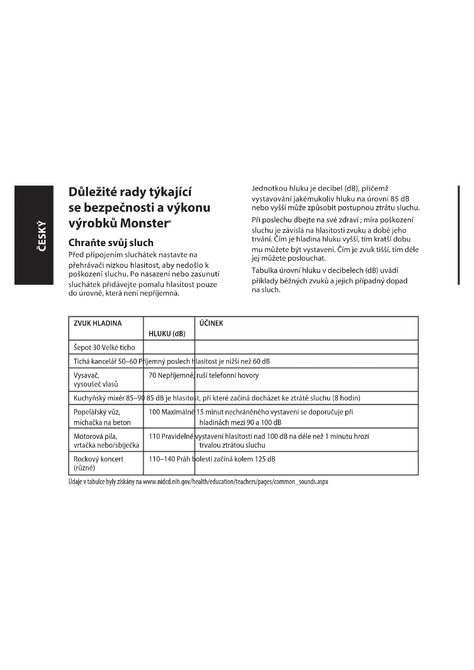 Chraňte svůj sluch Před připojením sluchátek nastavte na přehrávači nízkou hlasitost, aby nedošlo k poškození sluchu. Po nasazení nebo zasunutí sluchátek přidávejte pomalu hlasitost pouze do úrovně, která není nepříjemná. Jednotkou hluku je decibel (dB), přičemž vystavování jakémukoliv hluku na úrovni 85 dB nebo vyšší může způsobit postupnou ztrátu sluchu. Při poslechu dbejte na své zdraví ; míra poškození sluchu je závislá na hlasitosti zvuku a době jeho trvání. Čím je hladina hluku vyšší, tím kratší dobu mu můžete být vystaveni. Čím je zvuk tišší, tím déle jej můžete poslouchat. Tabulka úrovní hluku v decibelech (dB) uvádí příklady běžných zvuků a jejich případný dopad na sluch. ZVUK HLADINA HLUKU (dB) ÚČINEK Šepot 30 Velké ticho Tichá kancelář 50–60 Příjemný poslech hlasitost je nižší než 60 dB Vysavač, vysoušeč vlasů 70 Nepříjemné; ruší telefonní hovory Kuchyňský mixér 85–90 85 dB je hlasitost, při které začíná docházet ke ztrátě sluchu (8 hodin) Popelářský vůz, míchačka na beton 100 Maximálně 15 minut nechráněného vystavení se doporučuje při hladinách mezi 90 a 100 dB Motorová pila, vrtačka nebo/sbíječka 110 Pravidelné vystavení hlasitosti nad 100 dB na déle než 1 minutu hrozí trvalou ztrátou sluchu Rockový koncert (různé) 110–140 Práh bolesti začíná kolem 125 dB Údaje v tabulce byly získány na www.nidcd.nih.gov/health/education/teachers/pages/common_sounds.aspx ČESKÝVyužívejte co nejlépe své vybavení a užívejte si skvělý poslech i při zachování bezpečné hlasitosti. Naše sluchátka umožňují slyšet více detailů při nižších hlasitostech než kdy dříve. Zjistěte, jaká je bezpečná úroveň poslechu a přečtěte si další důležité bezpečnostní pokyny od Asociace spotřební elektroniky na www. ce.org. Důležité informace o tom, jak předcházet poškození sluchu hlukem a komplexní výčet hluků, které mohou poškození způsobit, najdete na webových stránkách Nadace výzkumu hluchoty na www.drf.org. Fyziologie ucha a sluchu Více dalších informací o tom, jak vysoká hlasitost působí na ucho a tabulky najdete na www.abelard.org/hear/hear.php#loud-music Dbejte na bezpečnost Sluchátka nepoužívejte, pokud to není bezpečné, např. při řízení auta, přecházení ulice a během jízdy na kole takové činnosti či v takovém prostředí, kdy je zapotřebí věnovat okolí plnou pozornost. Je nebezpečné, a v mnoha zemích nezákonné, používat sluchátka při řízení vozidla, protože to snižuje schopnost slyšet důležité zvuky vně vozu, např. houkání jiného vozidla nebo sirény záchranářského vozidla. Při řízení vozidla sluchátka nepoužívejte. Místo toho použijte jeden z vysílačů Monster FM k poslechu zařízení mobilních médií. Sluchátka „v záběhu“ Zabíhání sluchátek? To je vtip, že jo? Ne, není Jako jakýkoliv jiný složitý výrobek, ať jsou to auta nebo sluchátka, jedná se o mechanické zařízení, jehož funkce se používáním ustálí. Nová sluchátka od nás mají skvělý zvuk tak, jak je nová zakoupíte, ale po nějaké době používání „dozrají“ a jejich zvuk je ještě lepší. Doporučujeme sluchátka používat 8 hodin. Po 20 hodinách používání by měla být plně zaběhnutá. Přejeme dobrou zábavu. Baterie Pokud to lze, je nutné baterie řádně recyklovat nebo likvidovat. Kladívko Předsíňohlemýžďový nerv Třmínek Bubínek Zvukovod Hlemýžď Malá kůstka ve středním Vchod K nosu, hrdlu uchu ČESKÝInformace pro spotřebitele při uplatňování Směrnice Evropského parlamentu a Rady 2002/96/ES o odpadních elektrických a elektronických zařízeních Tento výrobek podléhá předpisům Evropské Unie, které se vztahují na opětovné použití a recyklaci použitých elektrických a elektronických zařízení. K výrobě tohoto výrobku bylo nutné využít přírodních zdrojů. Tento výrobek může obsahovat nebezpečné látky. Výše uvedený symbol umístěný na výrobku nebo na jeho obalu znamená, že daný výrobek nesmí být odstraněn s ostatním odpadem pocházejícím z Vaší domácnosti. Je Vaší povinností toto elektrozařízení odevzdat na určené sběrné místo k recyklaci elektroodpadu. Oddělený sběr a recyklace elektroodpadu při jeho odstranění napomůže zachování přírodních zdrojů a zajistí, aby recyklace proběhla způsobem, který chrání lidské zdraví a životní prostředí. Podrobné údaje o tom, kde elektroodpad můžete odevzdat k recyklaci, získáte na příslušném úřadu místní samosprávy, u společnosti zajištující zpracování odpadu z domácností nebo v obchodě, kde jste daný výrobek zakoupili. Více informací o výrobcích Monster získáte na internetových stránkách: www.MonsterProducts.com. Služby Monster