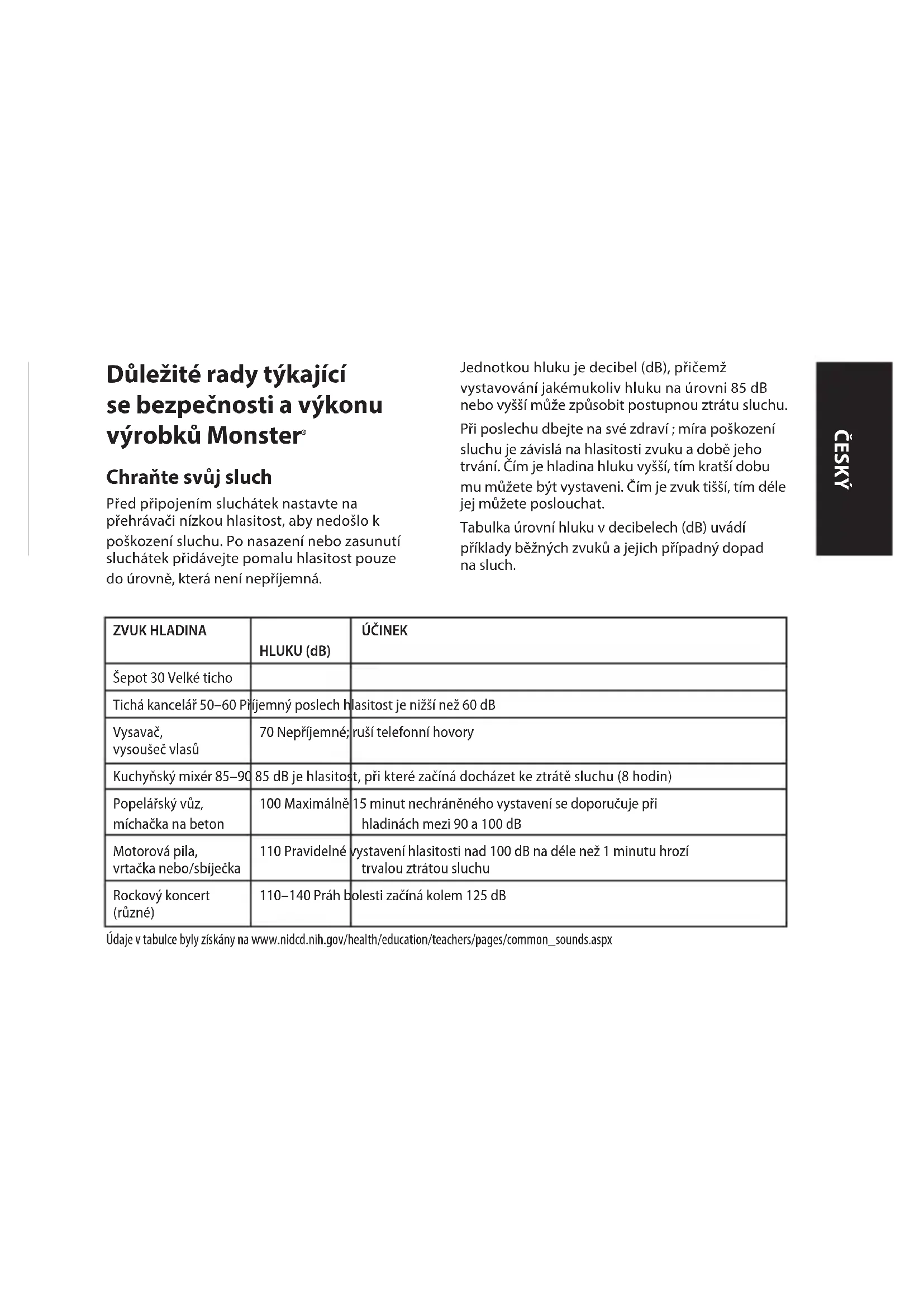 Chraňte svůj sluch Před připojením sluchátek nastavte na přehrávači nízkou hlasitost, aby nedošlo k poškození sluchu. Po nasazení nebo zasunutí sluchátek přidávejte pomalu hlasitost pouze do úrovně, která není nepříjemná. Jednotkou hluku je decibel (dB), přičemž vystavování jakémukoliv hluku na úrovni 85 dB nebo vyšší může způsobit postupnou ztrátu sluchu. Při poslechu dbejte na své zdraví ; míra poškození sluchu je závislá na hlasitosti zvuku a době jeho trvání. Čím je hladina hluku vyšší, tím kratší dobu mu můžete být vystaveni. Čím je zvuk tišší, tím déle jej můžete poslouchat. Tabulka úrovní hluku v decibelech (dB) uvádí příklady běžných zvuků a jejich případný dopad na sluch. ZVUK HLADINA HLUKU (dB) ÚČINEK Šepot 30 Velké ticho Tichá kancelář 50–60 Příjemný poslech hlasitost je nižší než 60 dB Vysavač, vysoušeč vlasů 70 Nepříjemné; ruší telefonní hovory Kuchyňský mixér 85–90 85 dB je hlasitost, při které začíná docházet ke ztrátě sluchu (8 hodin) Popelářský vůz, míchačka na beton 100 Maximálně 15 minut nechráněného vystavení se doporučuje při hladinách mezi 90 a 100 dB Motorová pila, vrtačka nebo/sbíječka 110 Pravidelné vystavení hlasitosti nad 100 dB na déle než 1 minutu hrozí trvalou ztrátou sluchu Rockový koncert (různé) 110–140 Práh bolesti začíná kolem 125 dB Údaje v tabulce byly získány na www.nidcd.nih.gov/health/education/teachers/pages/common_sounds.aspx ČESKÝVyužívejte co nejlépe své vybavení a užívejte si skvělý poslech i při zachování bezpečné hlasitosti. Naše sluchátka umožňují slyšet více detailů při nižších hlasitostech než kdy dříve. Zjistěte, jaká je bezpečná úroveň poslechu a přečtěte si další důležité bezpečnostní pokyny od Asociace spotřební elektroniky na www. ce.org. Důležité informace o tom, jak předcházet poškození sluchu hlukem a komplexní výčet hluků, které mohou poškození způsobit, najdete na webových stránkách Nadace výzkumu hluchoty na www.drf.org. Fyziologie ucha a sluchu For additional information on what loud noises do to your ear and more on protecting the ear, reference www.abelard.org/hear/hear. php#loud-music Dbejte na bezpečnost Sluchátka nepoužívejte, pokud to není bezpečné, např. při řízení auta, přecházení ulice a během jízdy na kole takové činnosti či v takovém prostředí, kdy je zapotřebí věnovat okolí plnou pozornost. Je nebezpečné, a v mnoha zemích nezákonné, používat sluchátka při řízení vozidla, protože to snižuje schopnost slyšet důležité zvuky vně vozu, např. houkání jiného vozidla nebo sirény záchranářského vozidla. Při řízení vozidla sluchátka nepoužívejte. Místo toho použijte jeden z vysílačů Monster FM k poslechu zařízení mobilních médií. Sluchátka „v záběhu“ Zabíhání sluchátek? To je vtip, že jo? Ne, není Jako jakýkoliv jiný složitý výrobek, ať jsou to auta nebo sluchátka, jedná se o mechanické zařízení, jehož funkce se používáním ustálí. Nová sluchátka od nás mají skvělý zvuk tak, jak je nová zakoupíte, ale po nějaké době používání „dozrají“ a jejich zvuk je ještě lepší. Doporučujeme sluchátka používat 8 hodin. Po 20 hodinách používání by měla být plně zaběhnutá. Přejeme dobrou zábavu. Baterie Pokud to lze, je nutné baterie řádně recyklovat nebo likvidovat. Předsíňohlemýžďový nerv Třmínek Bubínek Zvukovod Hlemýžď Vchod K nosu, hrdlu Malá kůstka ve středním uchu Kladívko ČESKÝInformace pro spotřebitele při uplatňování Směrnice Evropského parlamentu a Rady 2002/96/ES o odpadních elektrických a elektronických zařízeních Tento výrobek podléhá předpisům Evropské Unie, které se vztahují na opětovné použití a recyklaci použitých elektrických a elektronických zařízení. K výrobě tohoto výrobku bylo nutné využít přírodních zdrojů. Tento výrobek může obsahovat nebezpečné látky. Výše uvedený symbol umístěný na výrobku nebo na jeho obalu znamená, že daný výrobek nesmí být odstraněn s ostatním odpadem pocházejícím z Vaší domácnosti. Je Vaší povinností toto elektrozařízení odevzdat na určené sběrné místo k recyklaci elektroodpadu. Oddělený sběr a recyklace elektroodpadu při jeho odstranění napomůže zachování přírodních zdrojů a zajistí, aby recyklace proběhla způsobem, který chrání lidské zdraví a životní prostředí. Podrobné údaje o tom, kde elektroodpad můžete odevzdat k recyklaci, získáte na příslušném úřadu místní samosprávy, u společnosti zajištující zpracování odpadu z domácností nebo v obchodě, kde jste daný výrobek zakoupili. Více informací o výrobcích Monster získáte na internetových stránkách: www.MonsterProducts.com. Služby Monster