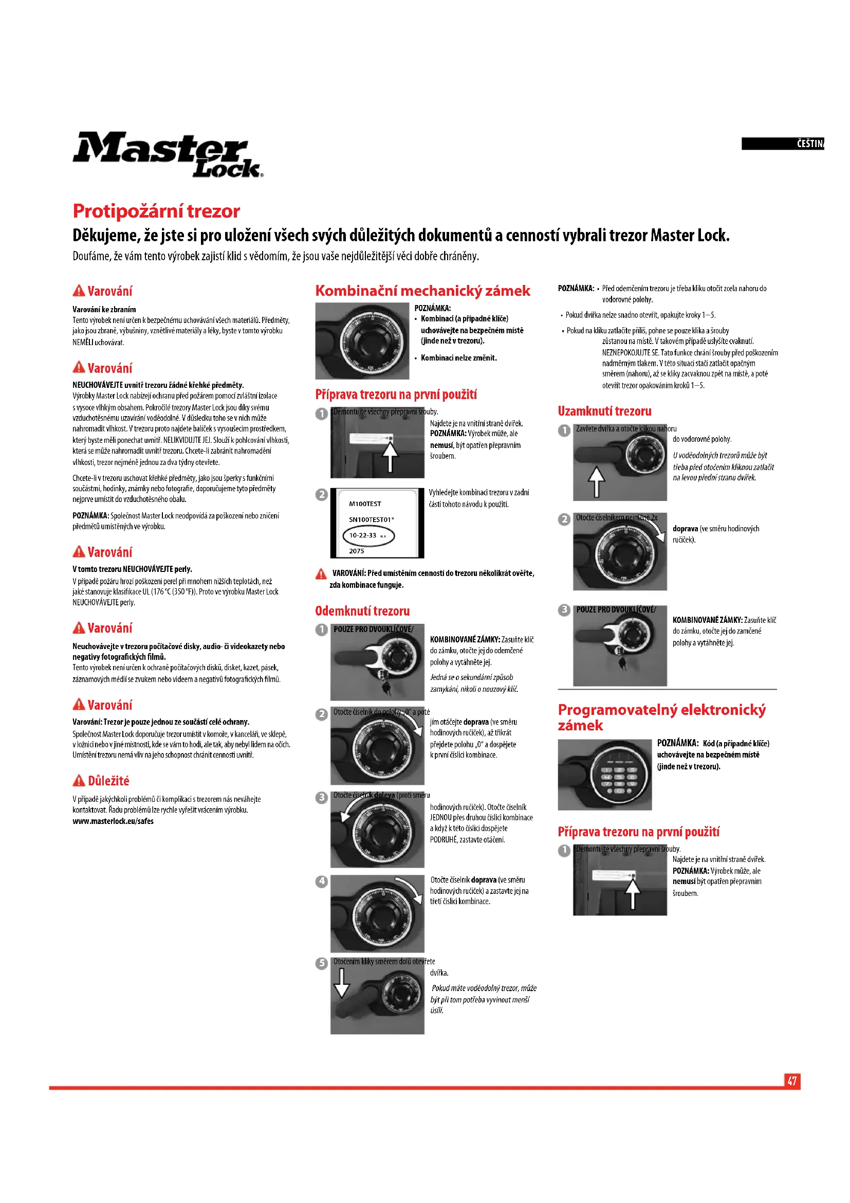 Demontujte všechny přepravní šrouby. Najdete je na vnitřní straně dvířek.POZNÁMKA: Výrobek může, ale nemusí být opatřen přepravním šroubem. Protipožární trezor Děkujeme, že jste si pro uložení všech svých důležitých dokumentů acenností vybrali trezor Master Lock. Doufáme, že vám tento výrobek zajistí klid svědomím, že jsou vaše nejdůležitější věci dobře chráněny. Varování Varování ke zbranímTento výrobek není určen kbezpečnému uchovávání všech materiálů. Předměty, jako jsou zbraně, výbušniny, vznětlivé materiály aléky, byste vtomto výrobku NEMĚLI uchovávat. Varování NEUCHOVÁVEJTE uvnitř trezoru žádné křehké předměty.Výrobky Master Lock nabízejí ochranu před požárem pomocí zvláštní izolace svysoce vlhkým obsahem. Pokročilé trezory Master Lock jsou díky svému vzduchotěsnému uzavírání voděodolné. Vdůsledku toho se vnich může nahromadit vlhkost. Vtrezoru proto najdete balíček svysoušecím prostředkem, který byste měli ponechat uvnitř. NELIKVIDUJTE JEJ. Slouží kpohlcování vlhkosti, která se může nahromadit uvnitř trezoru. Chcete-li zabránit nahromadění vlhkosti, trezor nejméně jednou za dva týdny otevřete.Chcete-li vtrezoru uschovat křehké předměty, jako jsou šperky sfunkčními součástmi, hodinky, známky nebo fotograe, doporučujeme tyto předměty nejprve umístit do vzduchotěsného obalu.POZNÁMKA: Společnost Master Lock neodpovídá za poškození nebo zničení předmětů umístěných ve výrobku. Varování Vtomto trezoru NEUCHOVÁVEJTE perly.Vpřípadě požáru hrozí poškození perel při mnohem nižších teplotách, než jaké stanovuje klasikace UL (176°C (350°F)). Proto ve výrobku Master Lock NEUCHOVÁVEJTE perly. Varování Neuchovávejte v trezoru počítačové disky, audio- či videokazety nebo negativy fotograckých lmů.Tento výrobek není určen kochraně počítačových disků, disket, kazet, pásek, záznamových médií se zvukem nebo videem anegativů fotograckých lmů. Varování Varování: Trezor je pouze jednou ze součástí celé ochrany.Společnost Master Lock doporučuje trezor umístit vkomoře, vkanceláři, ve sklepě, vložnici nebo vjiné místnosti, kde se vám to hodí, ale tak, aby nebyl lidem na očích. Umístění trezoru nemá vliv na jeho schopnost chránit cennosti uvnitř. Důležité Vpřípadě jakýchkoli problémů či komplikaci strezorem nás neváhejte kontaktovat. Řadu problémů lze rychle vyřešit vrácením výrobku. www.masterlock.eu/safes Kombinační mechanický zámek POZNÁMKA: • Kombinaci (apřípadné klíče) uchovávejte na bezpečném místě (jinde než vtrezoru).• Kombinaci nelze změnit. Příprava trezoru na první použití