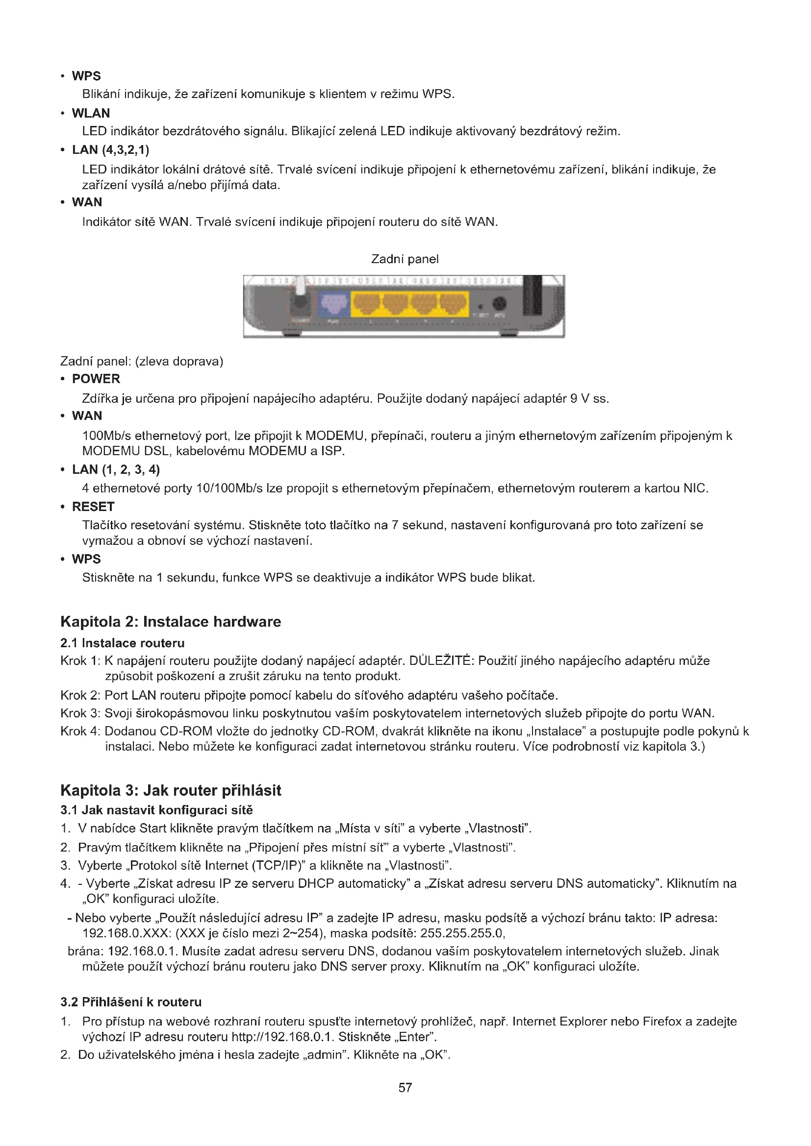 - WPS Stiskněte na 1 sekundu, funkce WPS se deaktivuje a indikátor WPS bude blikat. Kapitola 2: Instalace hardware