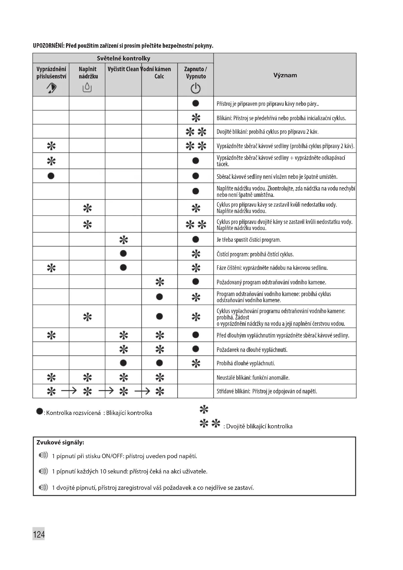 Nebezpečí : Varování upozorňující na rizika vážného nebo smrtelného zranění. Symbol blesku upozorňuje na rizika související s přítomností elektřiny. Pozor : Upozornění na případný výskyt poruch, poškození nebo zničení přístroje. Důležité upozornění : Obecná nebo důležitá poznámka k fungování přístroje. Piktogramy a výstražné signály Vyprázdněte sběrač na kávovou usazeninu a odkapávací misku: kontrolka zůstane svítit, pokud sběrač na kávovou usaze- ninu není správně nasazen nebo byl zpětně nainstalován za méně než 4 sekundy. Naplňte nádržku na vodu B Nastavení jemnosti mletí kávových zrn CLEAN Proveďte čištění Káva standard Silná káva CALC Proveďte odvápnění Tlačítko pára CLEAN + CALC Pokračujte s dlouhým propláchnutím Propláchnutí/údržba126