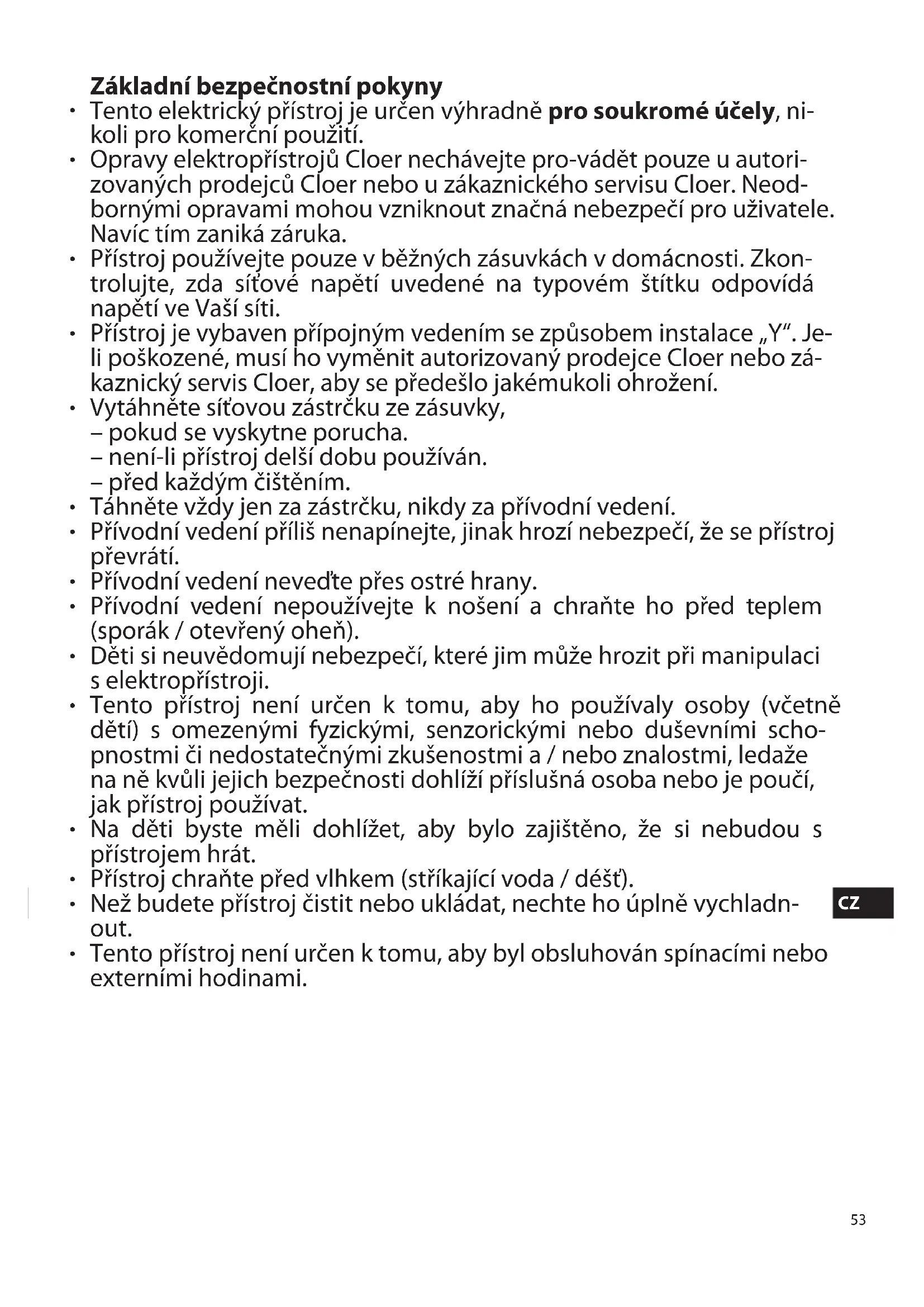 - Prístroj je vybaven przypojnym vedením se zpúsobem instalace „Y". Jeli poškozené, musi ho vyměnit autorizovány prodejce Cloer nebo zákaznicky servis Cloer, aby se predešlo jakémukoli ohroženi.