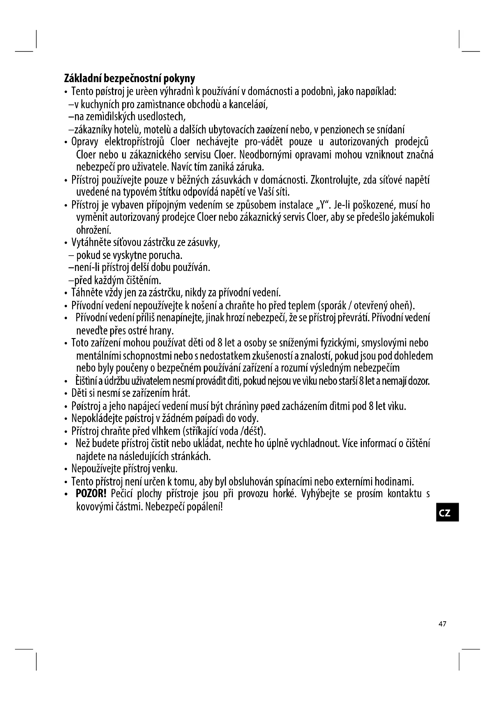 - Opravy elektropřístrojů Cloer nechávejte pro-vádět pouze u autorizovaných prodejců Cloer nebo u zákaznického servisu Cloer. Neodbornými opravami mohou vzniknout značná nebezpečí pro uživatele. Navíc tím zaniká záruka.