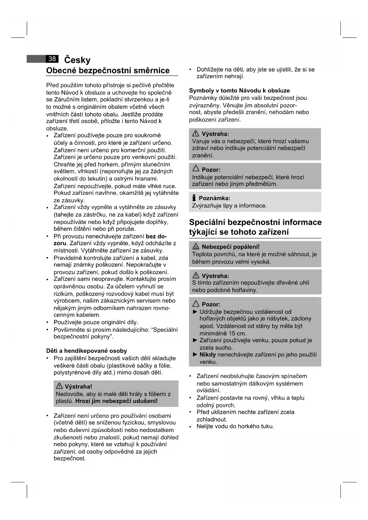 Dohlížejte na děti, aby jste se ujistili, že si se zařízením nehrají. Symboly v tomto Návodu k obsluze Poznámky důležité pro vaši bezpečnost jsou zvýrazněny. Věnujte jim absolutní pozor- nost, abyste předešli zranění, nehodám nebo poškození zařízení. Výstraha: Varuje vás o nebezpečí, které hrozí vašemu zdraví nebo indikuje potenciální nebezpečí zranění. Pozor: Indikuje potenciální nebezpečí, které hrozí zařízení nebo jiným předmětům. Poznámka: Zvýrazňuje tipy a informace. Speciální bezpečnostní informace týkající se tohoto zařízení Nebezpečí popálení! Teplota povrchů, na které je možné sáhnout, je během provozu velmi vysoká. Výstraha: S tímto zařízením nepoužívejte dřevěné uhlí nebo podobné hořlaviny. Pozor: Udržujte bezpečnou vzdálenost od hořlavých objektů jako je nábytek, záclony apod. Vzdálenost od stěny by měla být minimálně 15 cm. Zařízení používejte venku, pouze pokud je zcela sucho. Nikdy nenechávejte zařízení po jeho použití venku. Zařízení neobsluhujte časovým spínačem nebo samostatným dálkovým systémem ovládání. Zařízení postavte na rovný, vlhku a teplu odolný povrch. Před uklizením nechte zařízení zcela zchladnout. Nelijte vodu do horkého tuku.