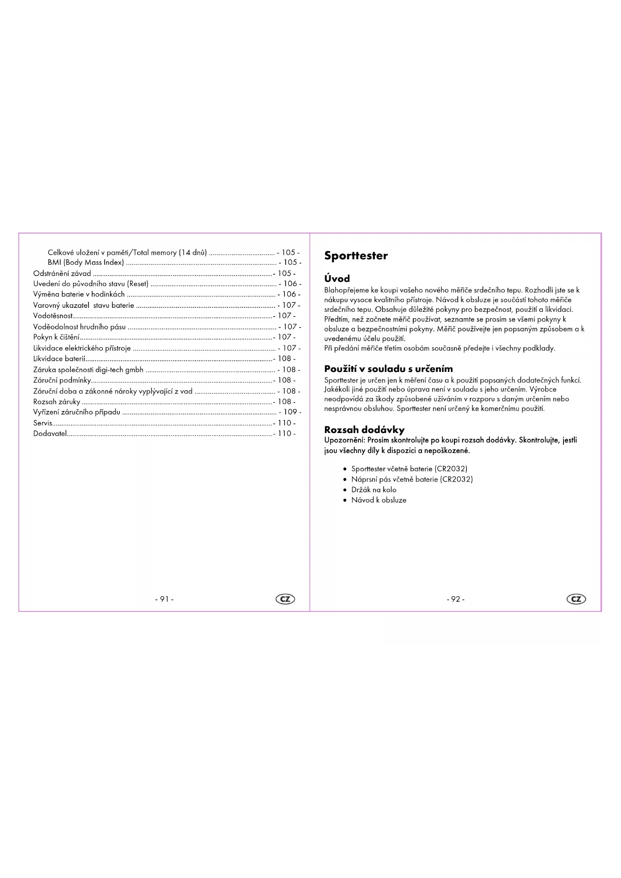 Likvidace baterií Použité baterie likvidujte nejlépe do nádob pro baterie v obchodních domech. Baterie nepatří do běžného domovního odpadu. Likvidujte baterie prosím v souladu s předpisy o třídění odpadu, nejlépe do komunálních sběren surovín Neopomente prosím na aktuálně platné předpisy. V případě pochybností se spojte s vašimi sběrnými surovinami. Záruka společnosti digi-tech gmbh Na tento sporttester výrobce poskytuje záruku v délce 3 let ode dne zakoupení. V případě vad máte vůči prodávajícímu výrobku zákonná práva. Tato zákonná práva nejsou omezena naší dále uvedenou zárukou. Tato zákonná práva nejsou naší následně zmiňovanou zárukou omezena. Záruční podmínky Záruční lhůta začíná běžet od data zakoupení. Dobře si uschovejte originální pokladní stvrzenku. Pokud se v průběhu tří let od data zakoupení tohoto výrobku vyskytnou závady materiálu nebo výrobní vady, bude tento výrobek námi zdarma opraven nebo nahrazen – podle naší volby. Uplatnění záruky vyžaduje, aby byl v tomto tříletém období předložen vadný přístroj a doklad o koupi (účtenka) a písemně bylo krátce uvedeno, o jakou závadu se jedná a kdy vznikla. Pokud závada zakláda nárok k uznání záruky, obdržíte od nás opravený nebo nový výrobek. Opravou nebo výměnou výrobku nezačíná běžet nová záruční lhůta. Záruční doba a zákonné nároky vyplývající z vad Záruční doba se neprodlužuje o dobu, po kterou bylo zboží v záruční opravě. To platí i pro vyměněné a opravené díly. Eventuální škody a vady existující již při koupi je nutno reklamovat ihned po vybalení. Opravy prováděné po uplynutí záruční doby budou placené. Rozsah záruky Tento přístroj byl pečlivě vyroben podle přísných směrnic kvality a před dodáním důkladně ověřen. Záruka se vztahuje na vady materiálu nebo výrobní vady. Tato záruka se nevztahuje na díly, které jsou vystaveny běžnému opotřebení a mohou-