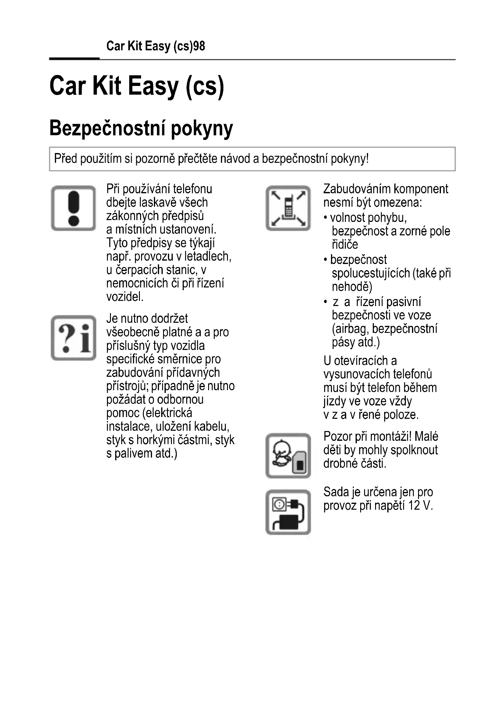 - Unidades de suporte para substituição Os produtos podem ser adquiridos jun- tos dos revendedores especializados ouna nossa loja On-line em: A Siemens não garante qualquer servi- ço de reparação e de substituição nos países onde os seus produtos não se- jam vendidos por revendedores autori- zados. Tensão de ali- mentação 10,8 V a 16 V Consumode energia máx. 1 A / máx. 1 mA (corren- tede repouso) Temperatura deserviço –20 °C a +55 °C Potência de saída máx. 1,3 W Acessórios originais da Siemens www.siemens- mobile.com/shopCar Kit Easy (cs)98 Car Kit Easy (cs) Bezpečnostní pokyny Před použitím si pozorně přečtěte návod a bezpečnostní pokyny! Při používání telefonu dbejte laskavě všech zákonných předpisů a místních ustanovení. Tyto předpisy se týkají např. provozu v letadlech, u čerpacích stanic, v nemocnicích či při řízení vozidel. Je nutno dodržet všeobecně platné a a pro příslušný typ vozidla specifické směrnice pro zabudování přídavných přístrojů; případně je nutno požádat o odbornou pomoc (elektrická instalace, uložení kabelu, styk s horkými částmi, styk s palivem atd.) Zabudováním komponent nesmí být omezena: