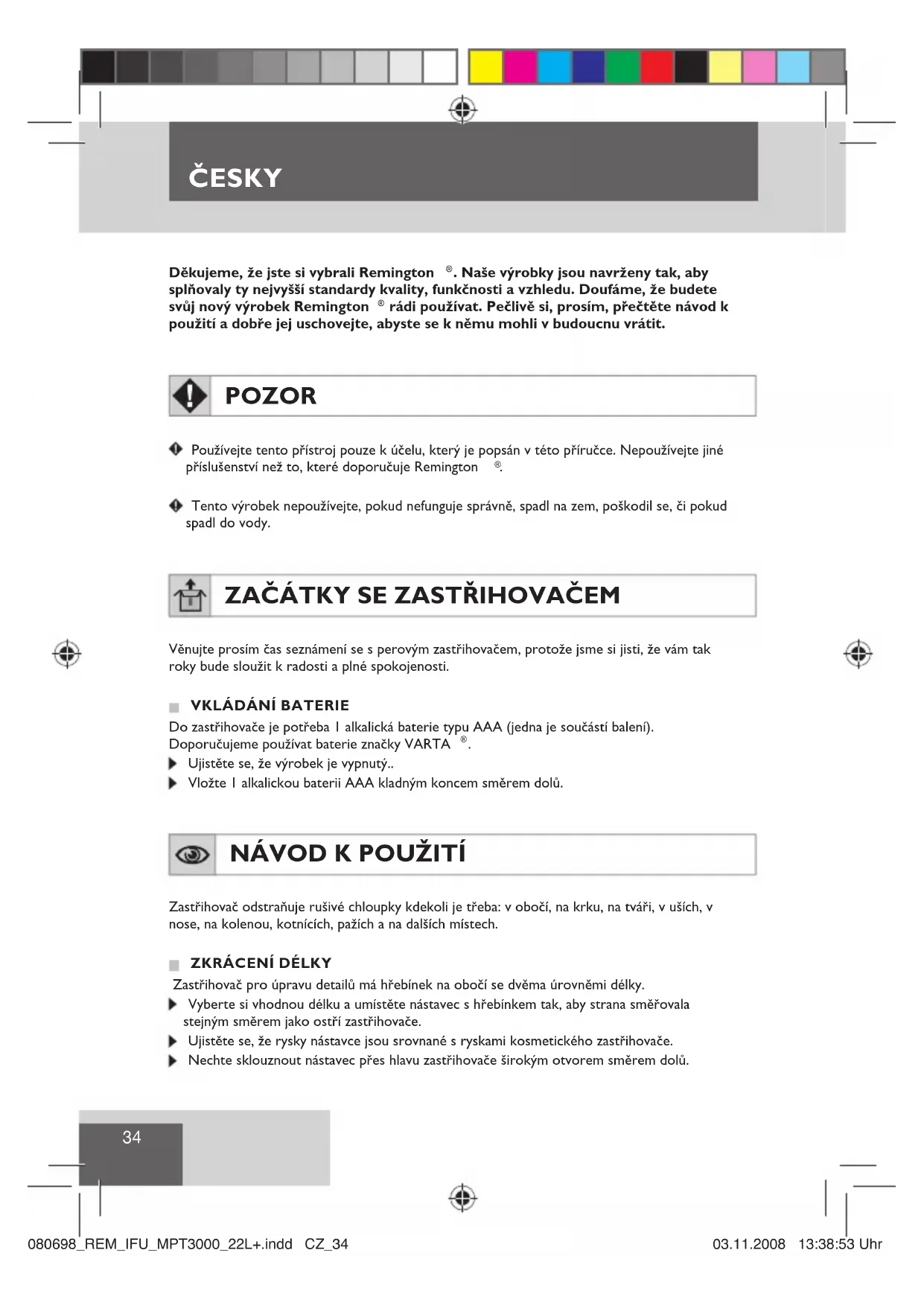 rádi používat. Pečlivě si, prosím, přečtěte návod k použití a dobře jej uschovejte, abyste se k němu mohli v budoucnu vrátit. POZOR Používejte tento přístroj pouze k účelu, který je popsán v této příručce. Nepoužívejte jiné příslušenství než to, které doporučuje Remington