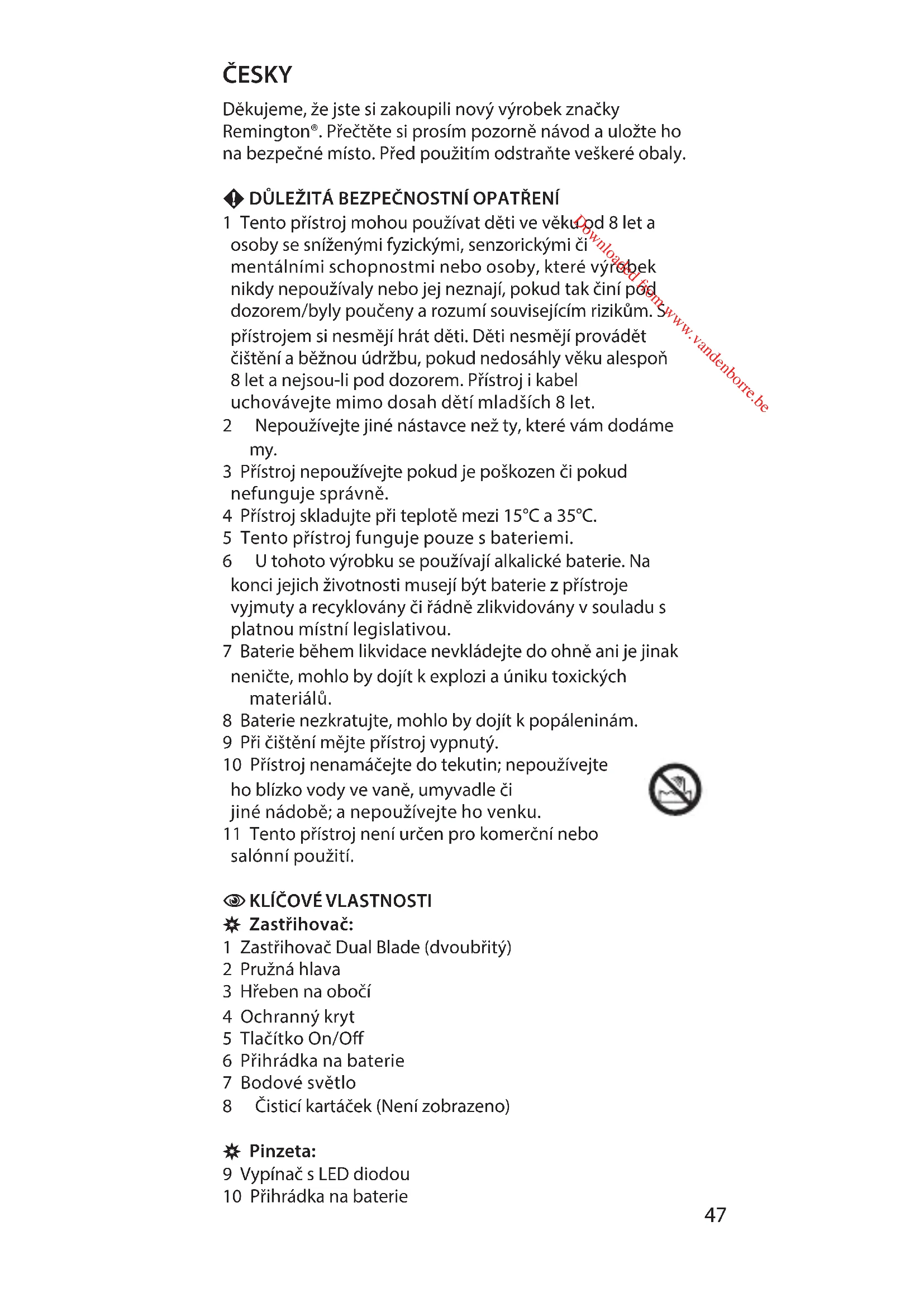 Downloaded from www.vandenborre.beDěkujeme, že jste si zakoupili nový výrobek značky Remington®. Přečtěte si prosím pozorně návod a uložte ho na bezpečné místo. Před použitím odstraňte veškeré obaly. F DŮLEŽITÁ BEZPEČNOSTNÍ OPATŘENÍ 1 Tento přístroj mohou používat děti ve věku od 8 let a osoby se sníženými fyzickými, senzorickými či mentálními schopnostmi nebo osoby, které výrobek nikdy nepoužívaly nebo jej neznají, pokud tak činí pod dozorem/byly poučeny a rozumí souvisejícím rizikům. S přístrojem si nesmějí hrát děti. Děti nesmějí provádět čištění a běžnou údržbu, pokud nedosáhly věku alespoň 8 let a nejsou-li pod dozorem. Přístroj i kabel uchovávejte mimo dosah dětí mladších 8 let. 2 Nepoužívejtejinénástavcenežty,kterévámdodáme my. 3 Přístroj nepoužívejte pokud je poškozen či pokud nefunguje správně. 4 Přístroj skladujte při teplotě mezi 15°C a 35°C. 5 Tento přístroj funguje pouze s bateriemi. 6 Utohotovýrobkusepoužívajíalkalickébaterie.Na konci jejich životnosti musejí být baterie z přístroje vyjmuty a recyklovány či řádně zlikvidovány v souladu s platnou místní legislativou. 7 Baterie během likvidace nevkládejte do ohně ani je jinak neničte, mohlo by dojít k explozi a úniku toxických materiálů. 8 Baterie nezkratujte, mohlo by dojít k popáleninám. 9 Při čištění mějte přístroj vypnutý. 10 Přístroj nenamáčejte do tekutin; nepoužívejte ho blízko vody ve vaně, umyvadle či jiné nádobě; a nepoužívejte ho venku. 11 Tento přístroj není určen pro komerční nebo salónní použití.