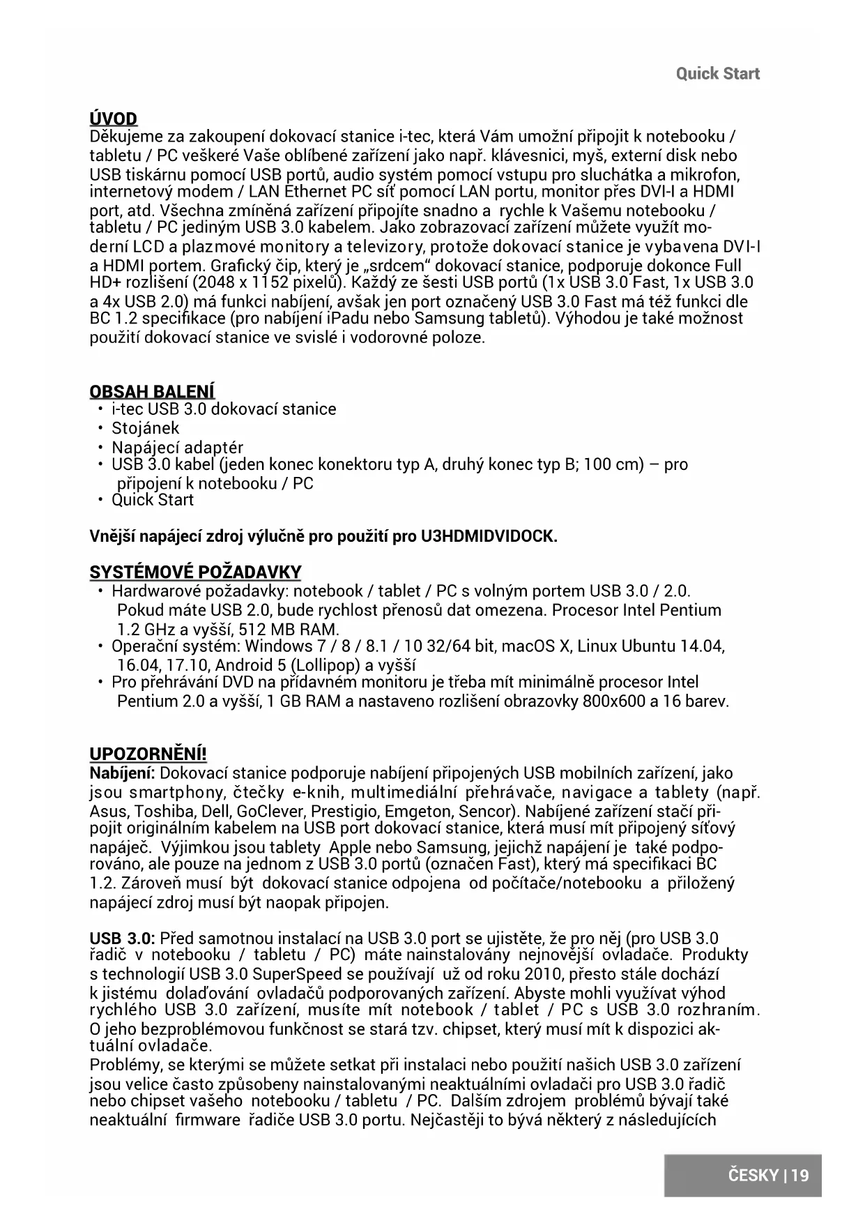 - Pro přehrávání DVD na přídavném monitoru je třeba mít minimálně procesor Intel Pentium 2.0 a vyšší, 1 GB RAM a nastaveno rozlišení obrazovky 800x600 a 16 barev. UPOZORNĚNÍ! Nabíjení: Dokovací stanice podporuje nabíjení připojených USB mobilních zařízení, jako jsou smartphony, čtečky e-knih, multimediální přehrávače, navigace a tablety (např. Asus, Toshiba, Dell, GoClever, Prestigio, Emgeton, Sencor). Nabíjené zařízení stačí při- pojit originálním kabelem na USB port dokovací stanice, která musí mít připojený síťový napáječ. Výjimkou jsou tablety Apple nebo Samsung, jejichž napájení je také podpo- rováno, ale pouze na jednom z USB 3.0 portů (označen Fast), který má specikaci BC 1.2. Zároveň musí být dokovací stanice odpojena od počítače/notebooku a přiložený napájecí zdroj musí být naopak připojen. USB 3.0: Před samotnou instalací na USB 3.0 port se ujistěte, že pro něj (pro USB 3.0 řadič v notebooku / tabletu / PC) máte nainstalovány nejnovější ovladače. Produkty s technologií USB 3.0 SuperSpeed se používají už od roku 2010, přesto stále dochází k jistému dolaďování ovladačů podporovaných zařízení. Abyste mohli využívat výhod rychlého USB 3.0 zařízení, musíte mít notebook / tablet / PC s USB 3.0 rozhraním. O jeho bezproblémovou funkčnost se stará tzv. chipset, který musí mít k dispozici ak- tuální ovladače. Problémy, se kterými se můžete setkat při instalaci nebo použití našich USB 3.0 zařízení jsou velice často způsobeny nainstalovanými neaktuálními ovladači pro USB 3.0 řadič nebo chipset vašeho notebooku / tabletu / PC. Dalším zdrojem problémů bývají také neaktuální rmware řadiče USB 3.0 portu. Nejčastěji to bývá některý z následujících20