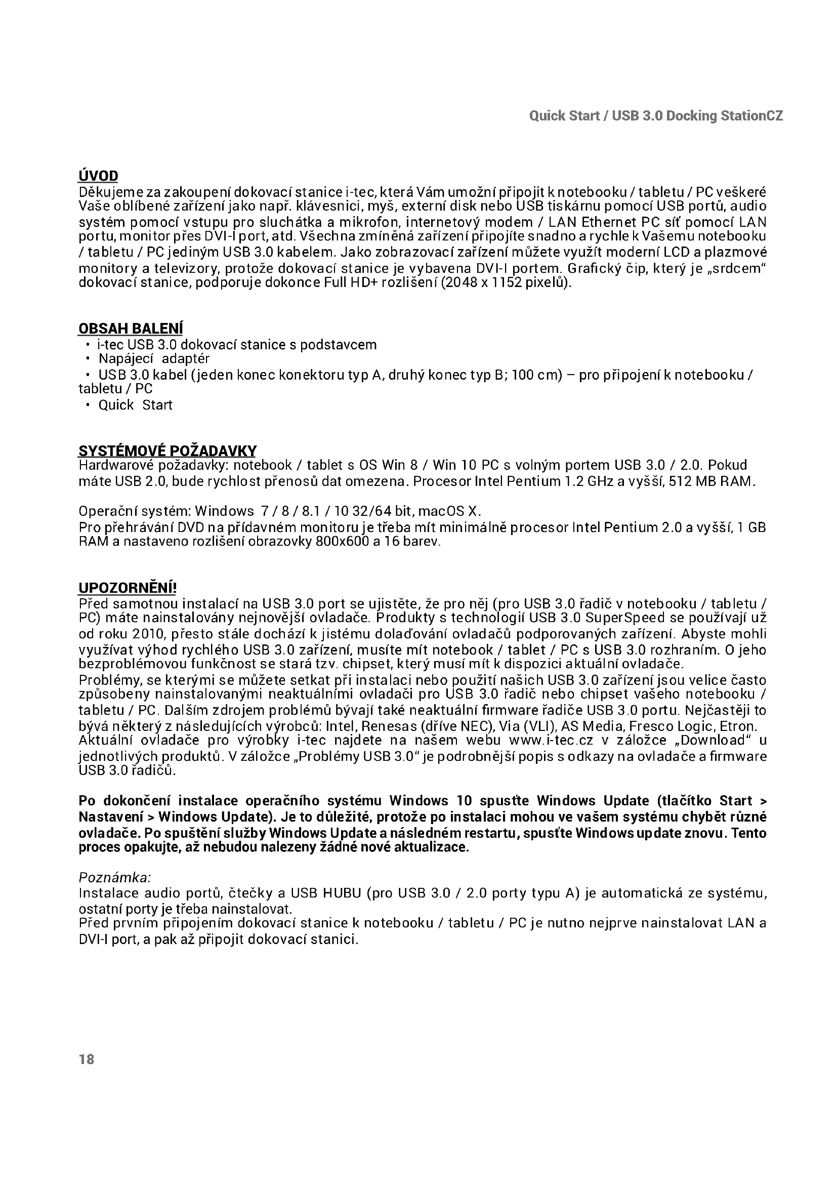 Hardwarové požadavky: notebook / tablet s OS Win 8 / Win 10 PC s volným portem USB 3.0 / 2.0. Pokud máte USB 2.0, bude rychlost přenosů dat omezena. Procesor Intel Pentium 1.2 GHz a vyšší, 512 MB RAM. Operační systém: Windows 7 / 8 / 8.1 / 10 32/64 bit, macOS X. Pro přehrávání DVD na přídavném monitoru je třeba mít minimálně procesor Intel Pentium 2.0 a vyšší, 1 GB RAM a nastaveno rozlišení obrazovky 800x600 a 16 barev. UPOZORNĚNÍ! Před samotnou instalací na USB 3.0 port se ujistěte, že pro něj (pro USB 3.0 řadič v notebooku / tabletu / PC) máte nainstalovány nejnovější ovladače. Produkty s technologií USB 3.0 SuperSpeed se používají už od roku 2010, přesto stále dochází k jistému dolaďování ovladačů podporovaných zařízení. Abyste mohli využívat výhod rychlého USB 3.0 zařízení, musíte mít notebook / tablet / PC s USB 3.0 rozhraním. O jeho bezproblémovou funkčnost se stará tzv. chipset, který musí mít k dispozici aktuální ovladače. Problémy, se kterými se můžete setkat při instalaci nebo použití našich USB 3.0 zařízení jsou velice často způsobeny nainstalovanými neaktuálními ovladači pro USB 3.0 řadič nebo chipset vašeho notebooku / tabletu / PC. Dalším zdrojem problémů bývají také neaktuální firmware řadiče USB 3.0 portu. Nejčastěji to bývá některý z následujících výrobců: Intel, Renesas (dříve NEC), Via (VLI), AS Media, Fresco Logic, Etron. Aktuální ovladače pro výrobky i-tec najdete na našem webu www.i-tec.cz v záložce „Download“ u jednotlivých produktů. V záložce „Problémy USB 3.0“ je podrobnější popis s odkazy na ovladače a firmware USB 3.0 řadičů. Po dokončení instalace operačního systému Windows 10 spusťte Windows Update (tlačítko Start > Nastavení > Windows Update). Je to důležité, protože po instalaci mohou ve vašem systému chybět různé ovladače. Po spuštění služby Windows Update a následném restartu, spusťte Windows update znovu. Tento proces opakujte, až nebudou nalezeny žádné nové aktualizace. Poznámka: Instalace audio portů, čtečky a USB HUBU (pro USB 3.0 / 2.0 porty typu A) je automatická ze systému, ostatní porty je třeba nainstalovat. Před prvním připojením dokovací stanice k notebooku / tabletu / PC je nutno nejprve nainstalovat LAN a DVI-I port, a pak až připojit dokovací stanici.19 Quick Start / USB 3.0 Docking Station CZ INSTALACE OVLADAČŮ VE WINDOWS 7 / 8 / 8.1 / 10 (32/64 BIT VERZE) Před prvním použitím nepřipojujte dokovací stanici k notebooku / tabletu / PC, dokud nenainstalujete příslušné ovladače pro LAN a DVI-I port. Ovladače zařízení je třeba nainstalovat pouze před prvním použitím. Stáhněte požadovaný software na našem webu www.i-tec.cz v záložce „Download“ u tohoto produktu. Ovladače nainstalujte dle následujícího postupu: Pro LAN a DVI-I port spusťte stažený soubor, zvolte jazyk instalace a postupujte dle pokynů na obrazovce. Poznámka: Ve Windows 7 / 8 / 8.1 / 10 instalujte DVI-I port jako uživatel „Administrator“. Obrazovka může v průběhu instalace ovladačů problikávat, jedná se o standardní proces. Po dokončení instalace doporučujeme restart notebooku / tabletu / PC. HARDWAROVÁ INSTALACE (PŘIPOJENÍ DOKOVACÍ STANICE K NOTEBOOKU / TABLETU / PC)