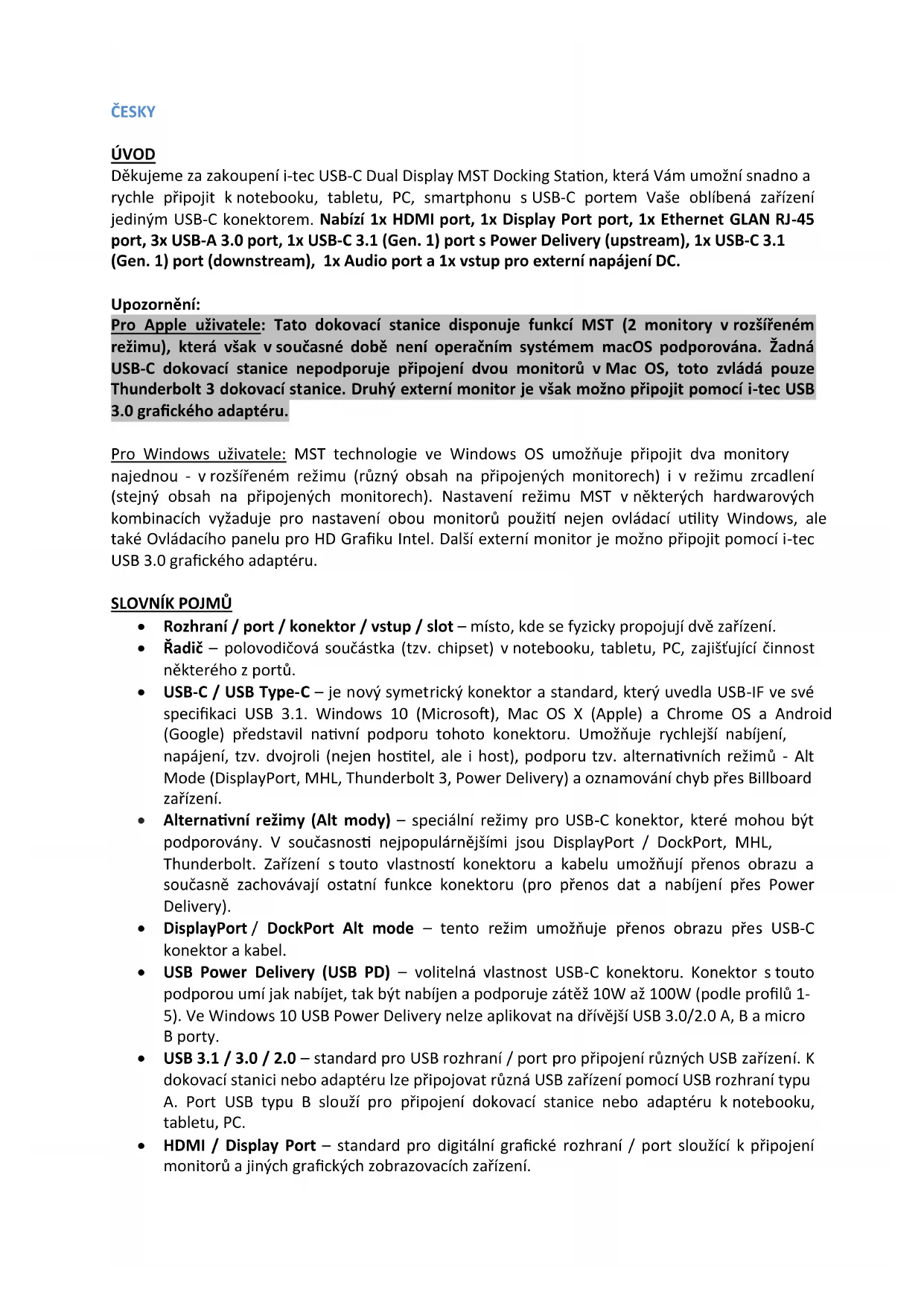 Rozhraní / port / konektor / vstup / slot – místo, kde se fyzicky propojují dvě zařízení. Řadič – polovodičová součástka (tzv. chipset) v notebooku, tabletu, PC, zajišťující činnost některého z portů. USB-C / USB Type-C – je nový symetrický konektor a standard, který uvedla USB-IF ve své specifikaci USB 3.1. Windows 10 (Microsoft), Mac OS X (Apple) a Chrome OS a Android (Google) představil nativní podporu tohoto konektoru. Umožňuje rychlejší nabíjení, napájení, tzv. dvojroli (nejen hostitel, ale i host), podporu tzv. alternativních režimů - Alt Mode (DisplayPort, MHL, Thunderbolt 3, Power Delivery) a oznamování chyb přes Billboard zařízení. Alternativní režimy (Alt mody) – speciální režimy pro USB-C konektor, které mohou být podporovány. V současnosti nejpopulárnějšími jsou DisplayPort / DockPort, MHL, Thunderbolt. Zařízení s touto vlastností konektoru a kabelu umožňují přenos obrazu a současně zachovávají ostatní funkce konektoru (pro přenos dat a nabíjení přes Power Delivery). DisplayPort / DockPort Alt mode – tento režim umožňuje přenos obrazu přes USB-C konektor a kabel. USB Power Delivery (USB PD) – volitelná vlastnost USB-C konektoru. Konektor s touto podporou umí jak nabíjet, tak být nabíjen a podporuje zátěž 10W až 100W (podle profilů 1- 5). Ve Windows 10 USB Power Delivery nelze aplikovat na dřívější USB 3.0/2.0 A, B a micro B porty. USB 3.1 / 3.0 / 2.0 – standard pro USB rozhraní / port pro připojení různých USB zařízení. K dokovací stanici nebo adaptéru lze připojovat různá USB zařízení pomocí USB rozhraní typu A. Port USB typu B slouží pro připojení dokovací stanice nebo adaptéru k notebooku, tabletu, PC. HDMI / Display Port – standard pro digitální grafické rozhraní / port sloužící k připojení monitorů a jiných grafických zobrazovacích zařízení. Audio – označení pro zvukové vstupní (mikrofon) nebo výstupní zařízení (sluchátka / reproduktory). Prosíme o pečlivé přečtení celého manuálu před zahájením práce s dokovací stanicí. Podrobnější informace naleznete v manuálu na našem webu www.i-tec-europe.eu v záložce „Download“ u tohoto produktu. SPECIFIKACE 1x USB-C 3.1 (Gen. 1) port pro datový přenos, přenosová rychlost až 5 Gbps; přes tento port nelze připojit další monitor, toto umí pouze Thunderbolt 3 dokovací stanice. 3x USB-A 3.0 port, přenosová rychlost až 5 Gbps; USB 3.0 port na předním panelu je se spec. BC 1.2 1x USB-C Power Delivery s profilem 4 (max. 60 W) pro připojení k notebooku nebo tabletu 1x Ethernet GLAN RJ-45 port, 10/100/1000 Mbps Grafické rozhraní: Jeden monitor: 1x HDMI max. rozlišení 3840x2160/30Hz nebo 1x Display Port max. rozlišení 3840x2160/30Hz Dva monitory (MST): podporuje až 1920x1200/60Hz 1x Audio/Mikrofon 2.1 Jack Režimy: Rozšířit, Zrcadlit a Primární monitor Podporované barvy 16 / 32 bitů Napájení z externího napájecího adaptéru - výstup: 20V/5A OS: Vyžaduje USB-C rozhraní s podporou "DisplayPort Alternate Mode" a „Power Delivery“ (ne všechna zařízení/systémy s rozhraním USB-C mají tento standard) nebo Thunderbolt 3 port – nyní Windows 10 32/64bit, Mac OS X, Chrome OS a Android 6 (Google) s Intel Broadwell Processors a R51 a vyšší Rozměry produktu: 155 x 85 x 27 mm Hmotnost produktu: 172 g OBSAH BALENÍ i-tec USB-C MST dokovací stanice USB-C kabel (délka 100 cm) Napájecí adaptér (výstup: DC 20V/5A, 100W, DC kabel 200 cm + síťový kabel 200 cm) Quick Start