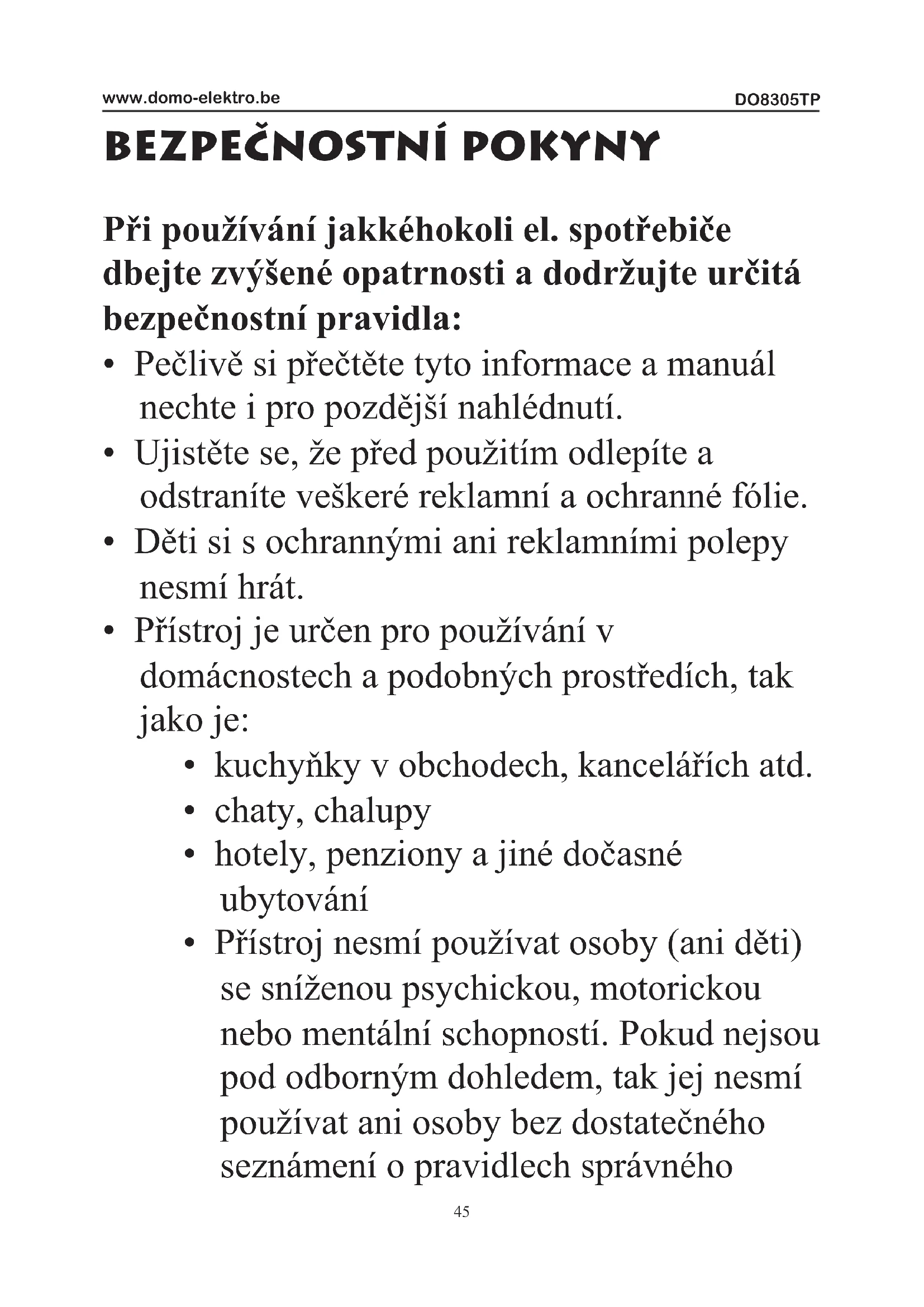 - Přístroj nesmí používat osoby (ani děti) se sníženou psychickou, motorickou nebo mentální schopností. Pokud nejsou pod odborným dohledem, tak jej nesmí používat ani osoby bez dostatečného seznámení o pravidlech správnéhoDO8305TP