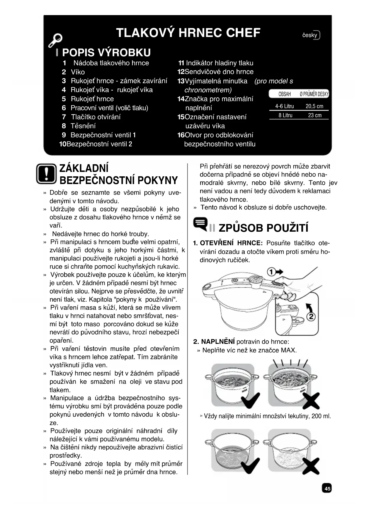 OBSAHØ PRŮMĚR DESKY4-6 Litru8 Litru20,5 cm23 cm » Dobře se seznamte se všemi pokyny uve- denými v tomto návodu. » Udržujte děti a osoby nezpůsobilé k jeho obsluze z dosahu tlakového hrnce v němž se vaří. » Nedávejte hrnec do horké trouby. » Při manipulaci s hrncem buďte velmi opatrní, zvláště při dotyku s jeho horkými částmi, k manipulaci používejte rukojeti a jsou-li horké ruce si chraňte pomocí kuchyňských rukavic. » Výrobek používejte pouze k účelům, ke kterým je určen. V žádném případě nesmí být hrnec otevírán silou. Nejprve se přesvědčte, že uvnitř není tlak, viz. Kapitola "pokyny k používání". » Při vaření masa s kůží, která se může vlivem tlaku v hrnci natahovat nebo smršťovat, nes- mí být toto maso porcováno dokud se kůže nevrátí do původního stavu, hrozí nebezpečí opaření. » Při vaření těstovin musíte před otevřením víka s hrncem lehce zatřepat. Tím zabráníte vystříknutí jídla ven. » Tlakový hrnec nesmí být v žádném případě používán ke smažení na oleji ve stavu pod tlakem. » Manipulace a údržba bezpečnostního sys- tému výrobku smí být prováděna pouze podle pokynů uvedených v tomto návodu k obslu- ze. » Používejte pouze originální náhradní díly náležející k vámi používanému modelu. » Na čištění nikdy nepoužívejte abrazivní čistící prostředky. » Používané zdroje tepla by měly mít průměr stejný nebo menší než je průměr dna hrnce. ZÁKLADNÍ