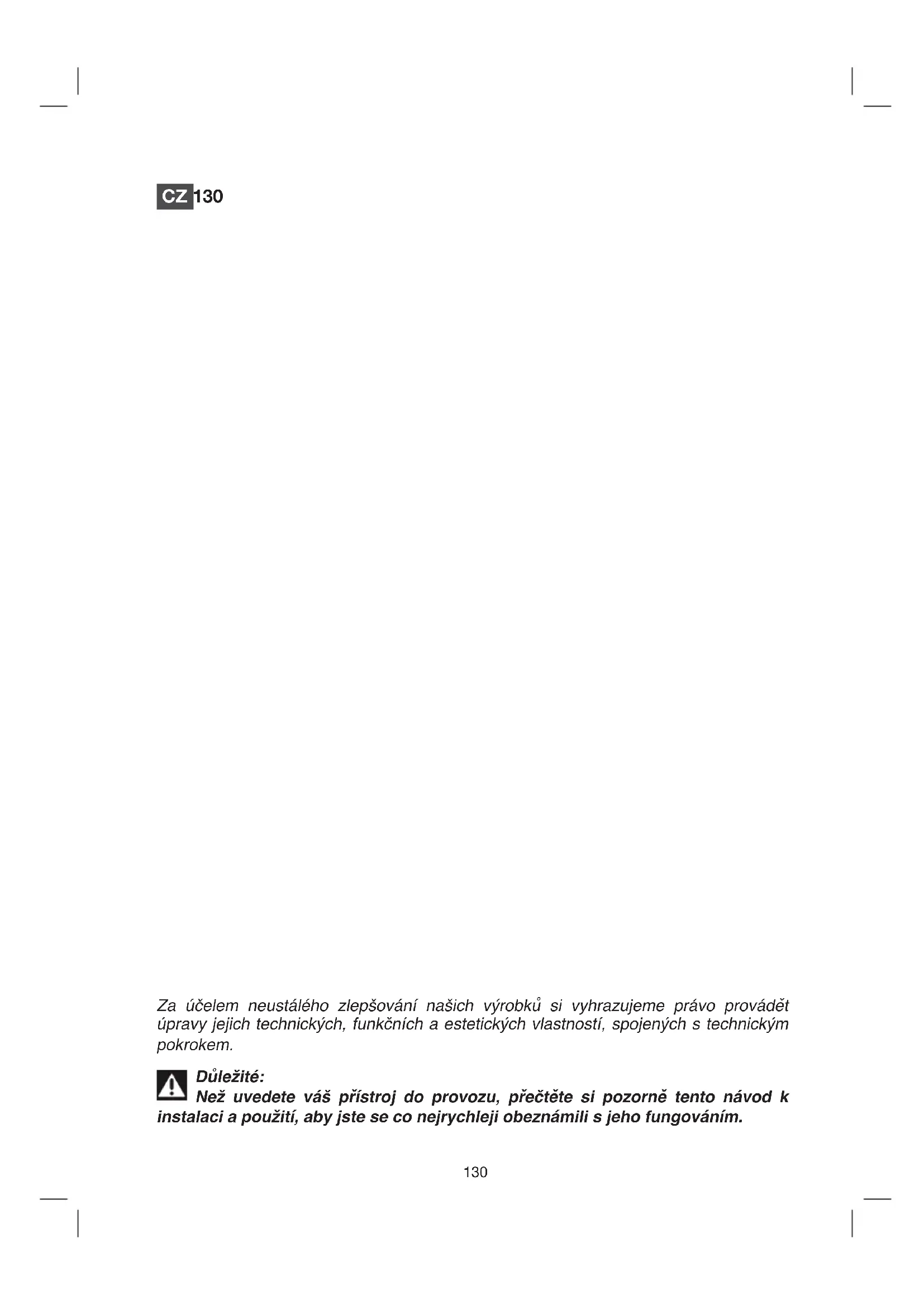 Zákroky, ktoré vyžaduje stroj, musia byť prevedené: — predajcom, — alebo akýmkoľvek iným kvalifi kovaným odborníkom, nositeľom značky. Do telefónu uveďte kompletnú referenciu stroja (model, typ a sériové číslo). Tieto údaje sú uvedené na identifi kačnom štítku, umiestnenom na stroji.130 CZ 130 Za účelem neustálého zlepšování našich výrobků si vyhrazujeme právo provádět úpravy jejich technických, funkčních a estetických vlastností, spojených s technickým pokrokem. Důležité: Než uvedete váš přístroj do provozu, přečtěte si pozorně tento návod k instalaci a použití, aby jste se co nejrychleji obeznámili s jeho fungováním.131