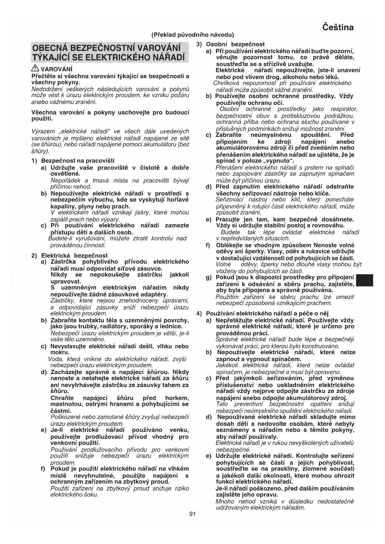TÝKAJÍCÍ SE ELEKTRICKÉHO NÁŘADÍ VAROVÁNÍ Přečtěte si všechna varování týkající se bezpečnosti a všechny pokyny. Nedodržení veškerých následujících varování a pokynů může vést k úrazu elektrickým proudem, ke vzniku požáru anebo vážnému zranění. Všechna varování a pokyny uschovejte pro budoucí použití. Výrazem „elektrické nářadí“ ve všech dále uvedených varováních je myšleno elektrické nářadí napájené ze sítě (se šňůrou), nebo nářadí napájené pomocí akumulátoru (bez šňůry).