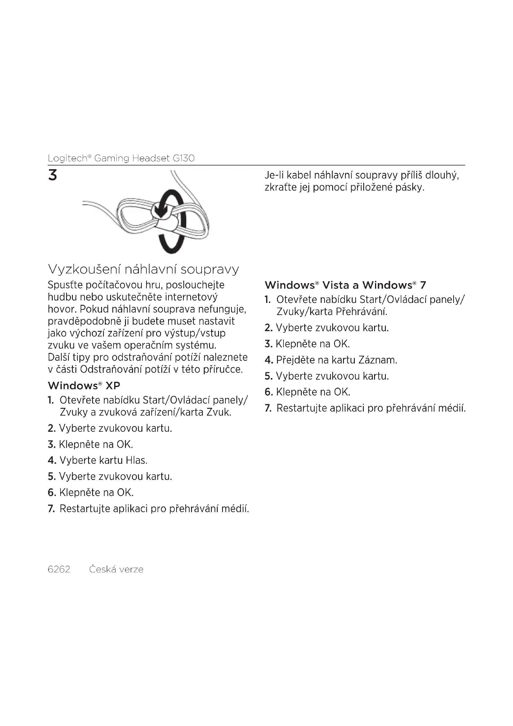 Je-li kabel náhlavní soupravy příliš dlouhý, zkraťte jej pomocí přiložené pásky. Vyzkoušení náhlavní soupravy Spusťte počítačovou hru, poslouchejte hudbu nebo uskutečněte internetový hovor. Pokud náhlavní souprava nefunguje, pravděpodobně ji budete muset nastavit jako výchozí zařízení pro výstup/vstup zvuku ve vašem operačním systému. Další tipy pro odstraňování potíží naleznete v části Odstraňování potíží v této příručce. Windows® XP