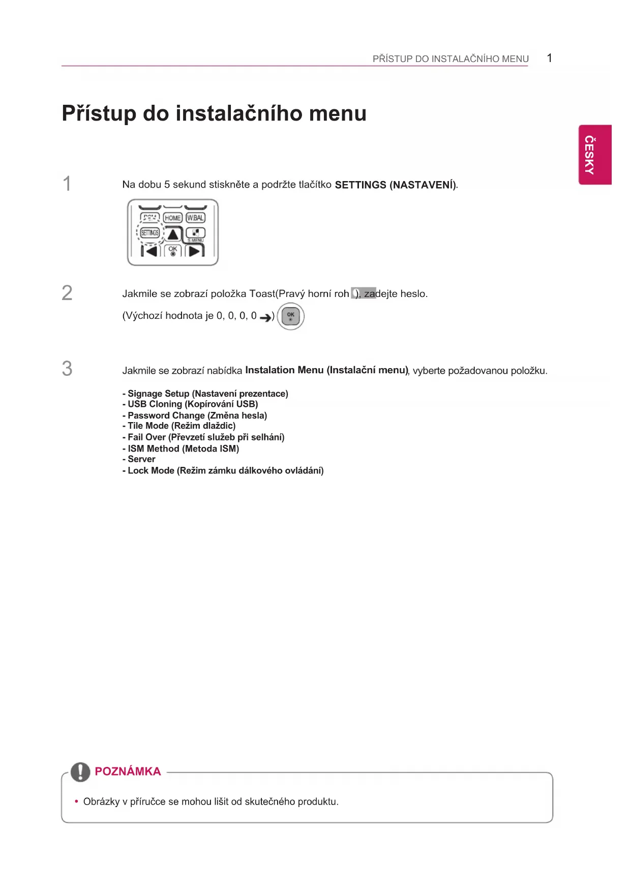 SuperSignApproval denied SuperSignConnected1 PŘÍSTUP DO INSTALAČNÍHO MENU CZE ČESKY Přístup do instalačního menu Jakmile se zobrazí nabídka Instalation Menu )Instalační menu(, vyberte požadovanou položku.Jakmile se zobrazí položka Toast)Pravý horní roh ), zadejte heslo. )Výchozí hodnota je 0, 0, 0, 0 )Na dobu 5 sekund stiskněte a podržte tlačítko SETTINGS (NASTAVENÍ)