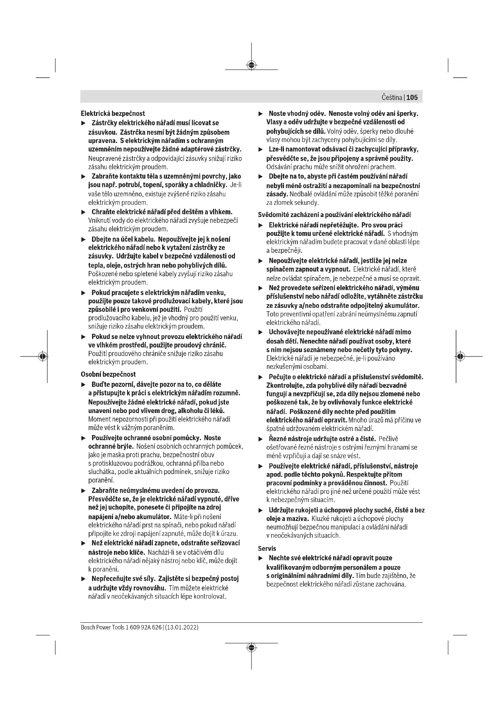 Nasazení nástroje (viz obrázekG) Upozornění: Nepoužívejte nástroje bez SDS-plus kvrtání spříklepem nebo sekání! Nástroje bez SDS-plus ajejich sklíčidlo se při vrtání spříklepem asekání poškodí. – Nasaďte výměnné rychloupínací sklíčidlo (1). – Pevně držte přídržný kroužek (21) rychloupínacího výměnného sklíčidla. Otevřete upínání nástroje otáčením přední objímky (20) natolik, aby bylo možné nasadit nástroj. Pevně držte přídržný kroužek (21) asilou otáčejte přední objímku (20) ve směru šipky, dokud neuslyšíte výrazné cvakání. – Zkontrolujte řádné upevnění zatáhnutím za nástroj. Upozornění: Pokud bylo upínání nástroje otevřené až nadoraz, může být při utahování upínání nástroje slyšet cvakání aupínání nástroje se nezavře. Vtom případě zatáhněte přední objímku (20) jednou proti směru šipky. Poté lze upínání nástroje zavřít. – Nastavte vypínač příklepů/otáčení (11) do polohy „vrtání“. Vyjmutí nástroje (viz obrázek H) – Pevně držte přídržný kroužek (21) rychloupínacího výměnného sklíčidla. Otevřete upínání nástroje otáčením přední objímky (20) ve směru šipky natolik, aby bylo možné vyjmout nástroj. Odsávání prachu/třísek Prach zmateriálů, jako jsou nátěry sobsahem olova, některé druhy dřeva, minerály akov, může být zdraví škodlivý. Kontakt sprachem nebo vdechnutí mohou upracovníka nebo osob nacházejících se vblízkosti vyvolat alergické reakce a/nebo onemocnění dýchacích cest. Určitý prach, jako dubový nebo bukový prach, je pokládán za karcinogenní, zvláště ve spojení spřídavnými látkami pro ošetření dřeva (chromát, ochranné prostředky na dřevo). Materiál obsahující azbest smějí opracovávat pouze specialisté. – Pokud možno používejte pro daný materiál vhodné odsávání prachu. – Zajistěte dobré větrání pracoviště. – Je doporučeno nosit ochrannou dýchací masku střídou filtruP2. Dodržujte předpisy pro obráběné materiály platné vpříslušné zemi. u Zabraňte hromadění prachu na pracovišti. Prach se může lehce vznítit. Odsávání prachu sGDE16 Plus (příslušenství) (vizobrázekI) Pro odsávání prachu je zapotřebí GDE16 Plus (příslušenství). Vysavač musí být vhodný pro obráběný materiál. Při odsávání obzvlášť zdraví škodlivého, karcinogenního nebo suchého prachu použijte speciální vysavač. Odsávání prachu sGDE 18V-26 D (příslušenství) Pro odsávání prachu je zapotřebí odsávací zařízení GDE 18V-26 D (příslušenství). Při používání GDE 18V-26 D dodržujte pokyny pro použití vsouladu surčením vpříslušném návodu kobsluze. Krytka pro zachycení prachu (příslušenství) (vizobrázekJ) Pro jednoduché zachycování prachu bez odsávání je zapotřebí krytka pro zachycení prachu (23). Provoz Uvedení do provozu u Dbejte na správné síťové napětí! Napětí zdroje proudu musí souhlasit súdaji na typovém štítku elektronářadí. Elektronářadí označené 230V smí být provozováno ina 220V. Nastavení druhu provozu Vypínačem příklepů/otáčení (11) zvolte druh provozu elektrického nářadí. – Pro změnu druhu provozu stiskněte odjišťovací tlačítko (10) aotočte vypínač příklepů/otáčení (11) do požadované polohy tak, aby slyšitelně zaskočil. Upozornění: Druh provozu měňte jen při vypnutém elektrickém nářadí! Jinak se může elektrické nářadí poškodit. Poloha pro vrtání spříklepem do betonu nebo kamene Poloha pro vrtání bez příklepu do dřeva, kovu, keramiky aplastu adále pro šroubování Poloha Vario-Lock pro nastavení polohy sekáče Vtéto poloze vypínač příklepů/otáčení(11) nezaskočí. Poloha pro sekání Nastavení směru otáčení Pomocí přepínače směru otáčení (7) můžete změnit směr otáčení elektrického nářadí. Při stisknutém vypínači (9) to ale není možné. Bosch Power Tools 1 609 92A 626 | (13.01.2022)110 | Čeština u Přepínač směru otáčení(7) používejte pouze tehdy, když je elektrické nářadí zastavené. Pro příklepové vrtání, vrtání asekání nastavte směr otáčení vždy na chod vpravo. – Chod vpravo: Otočte přepínač směru otáčení (7) na obou stranách až nadoraz do polohy . – Chod vlevo: Otočte přepínač směru otáčení (7) na obou stranách až nadoraz do polohy . Zapnutí avypnutí – Pro zapnutí elektrického nářadí stiskněte vypínač (9). – Pro zaaretování vypínače (9) ho podržte stisknutý astiskněte ještě aretační tlačítko (8). – Pro vypnutí elektrického nářadí uvolněte vypínač (9). Při zaaretovaném vypínači (9) nejprve vypínač stiskněte apak ho uvolněte. Nastavení otáček/příklepů Otáčky/příklepy zapnutého elektrického nářadí můžete plynule regulovat tím, jak moc stisknete vypínač (9). Mírným stisknutím vypínače (9) dosáhnete nízkých otáček/ příklepů. Spřibývajícím tlakem se otáčky/příklepy zvyšují. Změna polohy sekáče (Vario-Lock) Sekáč můžete zaaretovat v36 polohách. Tím můžete pokaždé zaujmout optimální pracovní pozici. – Nasaďte sekáč do upínání nástroje. – Nastavte vypínač příklepů/otáčení (11) do polohy „Vario- Lock“. – Otočte nástroj do požadované polohy. – Nastavte vypínač příklepů/otáčení (11) do polohy „sekání“. Upínání nástroje je tím zaaretované. – Směr otáčení nastavte při sekání na chod vpravo. Pracovní pokyny Nastavení hloubky vrtání (viz obrázek K) Pomocí hloubkového dorazu (13) lze nastavit požadovanou hloubku vrtáníX. – Stiskněte tlačítko pro nastavení hloubkového dorazu (12) anasaďte hloubkový doraz do přídavné rukojeti (14). Rýhování na hloubkovém dorazu (13) musí směřovat dolů. – Nástr