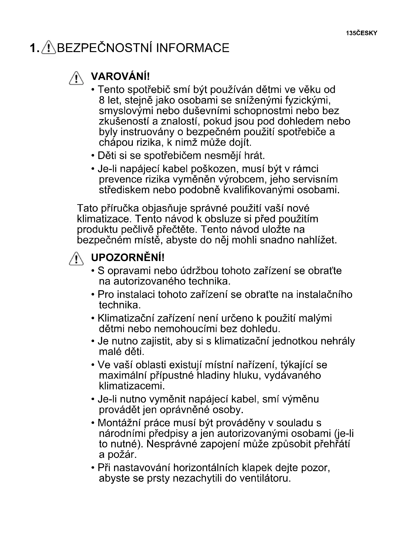 - Klimatizační zařízení není určeno k použití malými dětmi nebo nemohoucími bez dohledu.