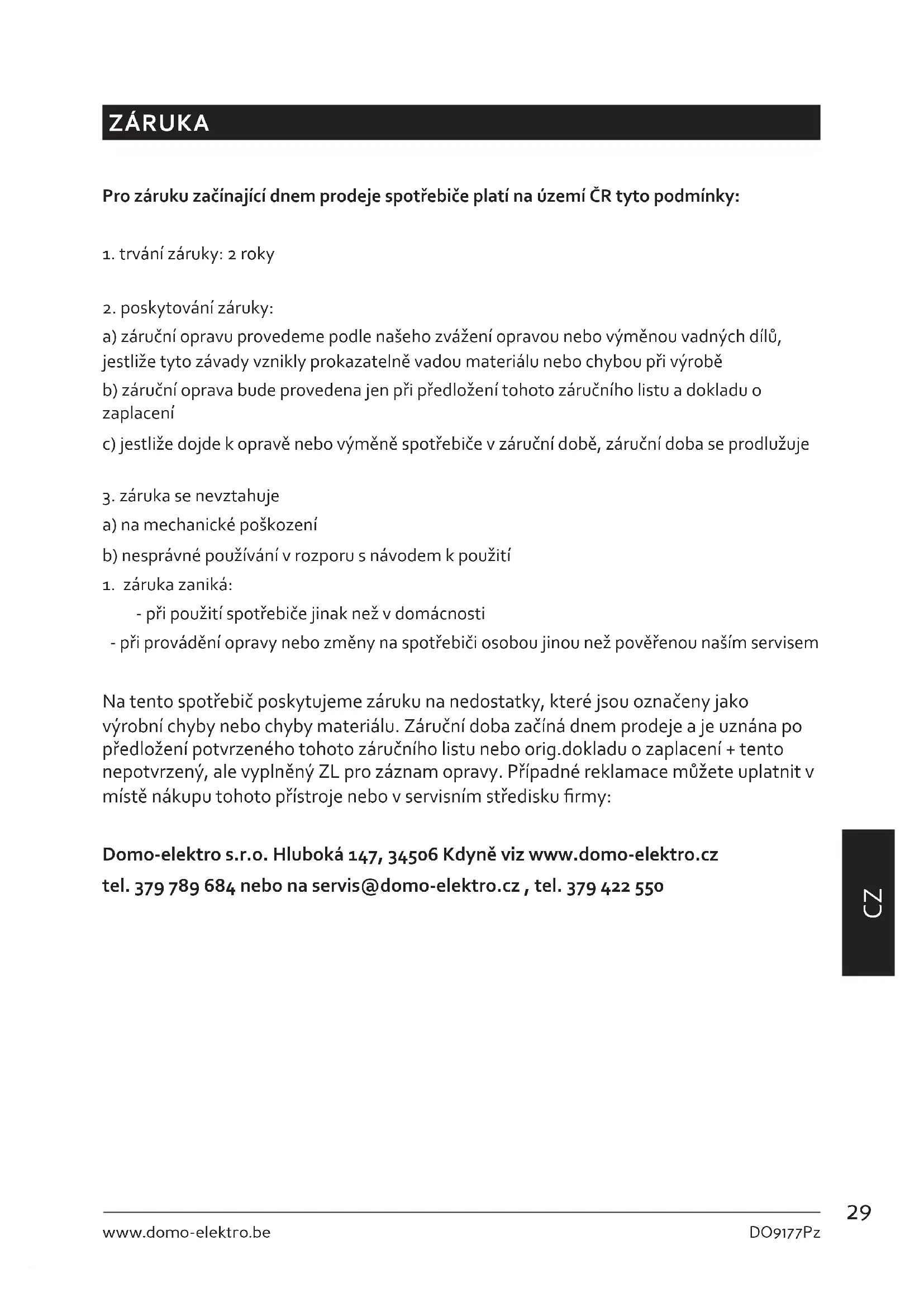 - při použití spotřebiče jinak než v domácnosti - při provádění opravy nebo změny na spotřebiči osobou jinou než pověřenou naším servisem Na tento spotřebič poskytujeme záruku na nedostatky, které jsou označeny jako výrobní chyby nebo chyby materiálu. Záruční doba začíná dnem prodeje a je uznána po předložení potvrzeného tohoto záručního listu nebo orig.dokladu o zaplacení + tento nepotvrzený, ale vyplněný ZL pro záznam opravy. Případné reklamace můžete uplatnit v místě nákupu tohoto přístroje nebo v servisním středisku rmy: Domo-elektro s.r.o. Hluboká 147, 34506 Kdyně viz www.domo-elektro.cz tel. 379 789 684 nebo na servis@domo-elektro.cz , tel. 379 422 55030 DO9177PZ