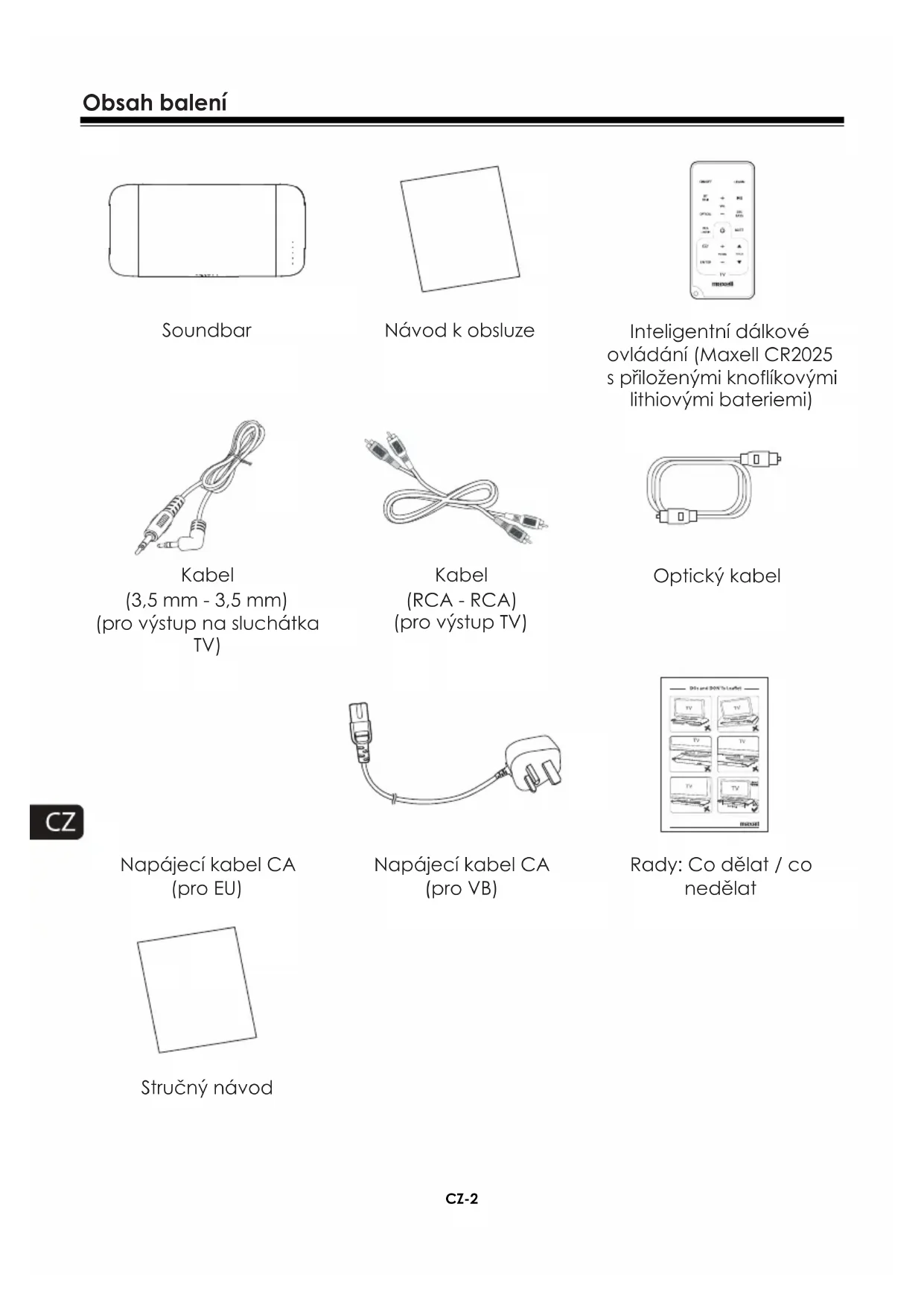 CZPřipojení CZ-8 Instalace televizoru na zařízení Maxell MXSB-252BT SoundBar je zařízení určené pro použití s TV o hmotnosti menší než 50 kg a se základnou o hloubce menší než 53 cm, respektive 30 cm. SoundBar MXSB-252BT lze použít s většinou televizorů o rozměru 42”. Není však možné použít obrazovku s katodovou trubicí (CRT), protože přístroj není určen pro použití s podobnými typy televizorů. Pro správnou instalaci přístroje dodržujte rady uvedené v kapitole "Co dělat" a "Co nedělat." Upozornění: snižte hlasitost televizoru nebo jiných zvukových zdrojů před prováděním jakýchkoli připojení, protože byste mohli být ohroženi zvukem vysoké hlasitosti. Připojení k napájení Upozornění! Nebezpečí poškození výrobku! - Ujistěte se, že jmenovité napětí zásuvky elektrické sítě odpovídá hodnotě na zadní nebo spodní straně přístroje. - Nebezpečí úrazu elektrickým proudem! Odpojte napájecí kabel vytažením zástrčky. Nikdy netahejte za kabel. - Ujistěte se, že používáte odpovídající napájecí kabel.