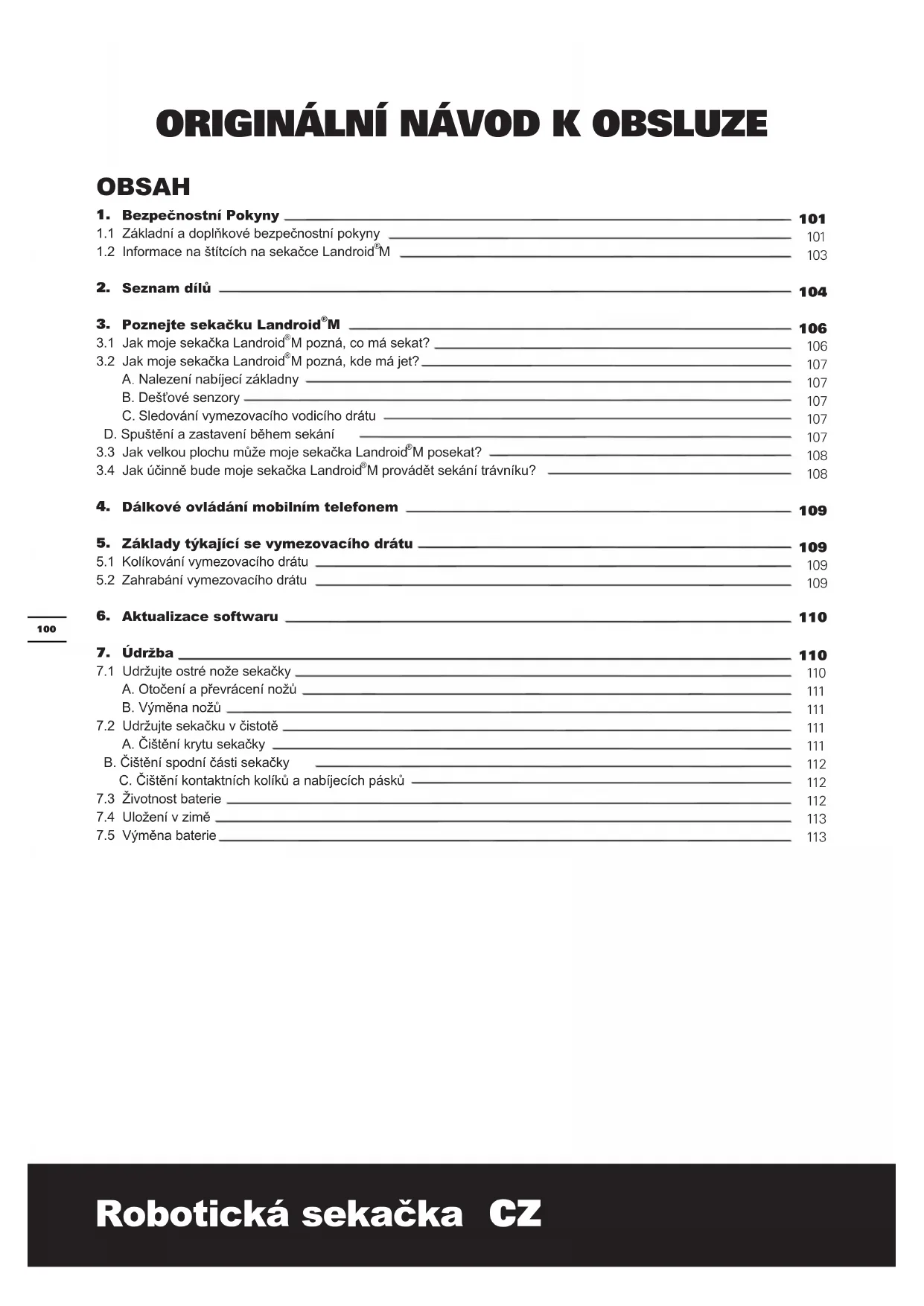 VAROVÁNÍ - Není-li tato robotická sekačka používána správně, může být nebezpečná. Před použitím této robotické sekačky si pečlivě přečtěte návod k obsluze a řádně si nastudujte jeho obsah. VAROVÁNÍ - Je-li tato sekačka v provozu, udržujte od ní bezpečnou vzdálenost. VAROVÁNÍ - Před prací na této sekačce nebo před jejím zvednutím použijte blokovací zařízení. VAROVÁNÍ - Nejezděte na této sekačce. Nevhazujte do ohně Je-li baterie likvidována nesprávným způsobem, její obsah se může dostat do vodního systému, což může být nebezpečné pro ekosystém. Nevyhazujte tyto baterie do netříděného komunálního odpadu. Baterie by měly být recyklovány. Akumulátory nevyhazujte, dosloužilé akumulátory odevzdejte v místním sběrném dvoře nebo v recyklační stanici. Nepoužívejte pro omývání této sekačky vysokotlakou myčku. Elektrický spotřebič třídy III Vysloužilé elektrické přístroje nevyhazujte společně s domovním odpadem. Nářadí recyklujte ve sběrnách k tomu účelu zřízených. O možnostech recyklace se informujte na místních úřadech nebo u prodejce.Robotická sekačka CZ