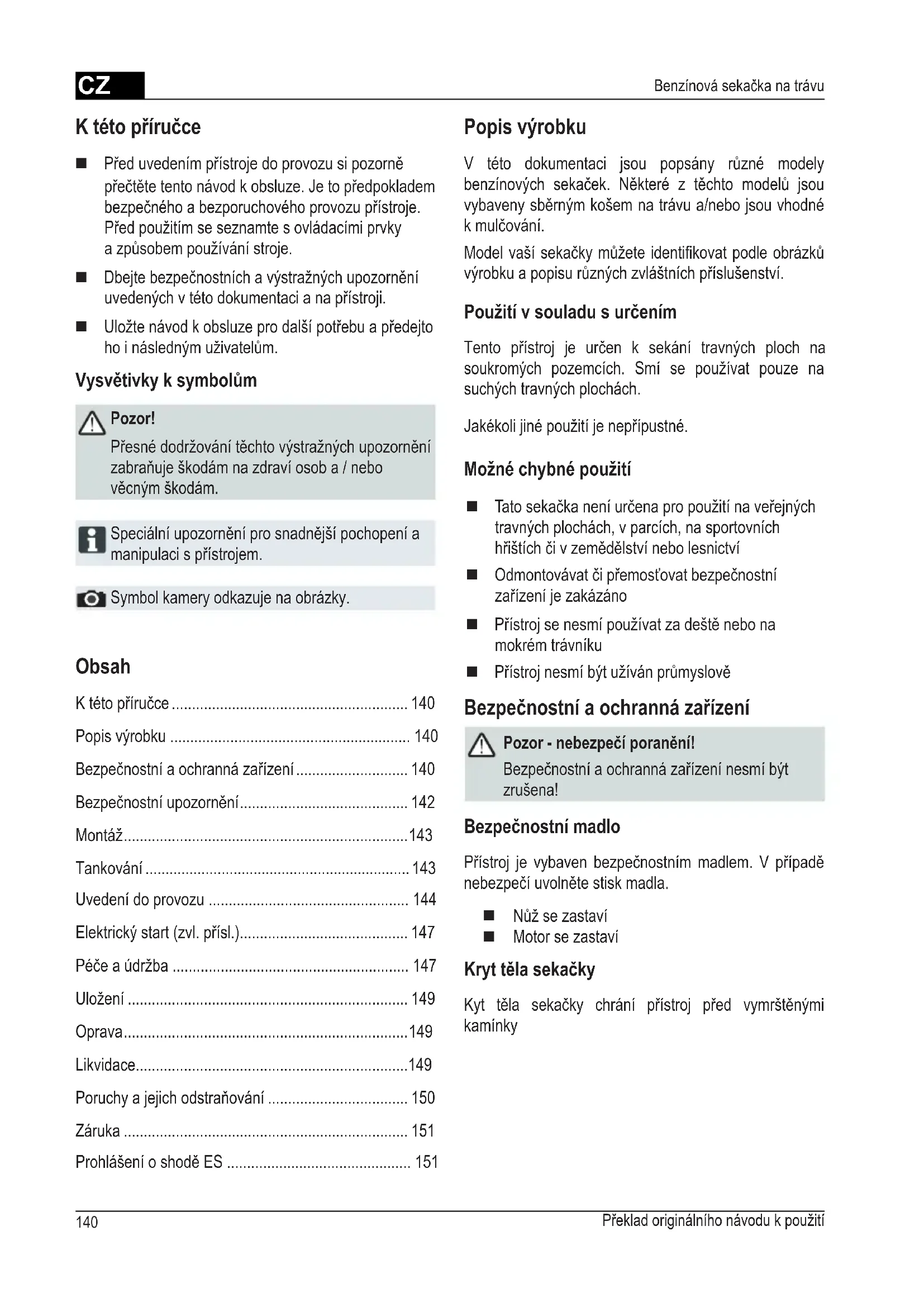- Prohlášení o shodě ES K této příručce Před uvedením přístroje do provozu si pozorně přečtěte tento návod k obsluze. Je to předpokladem bezpečného a bezporuchového provozu přístroje. Před použitím se seznamte s ovládacími prvky a způsobem používání stroje. Dbejte bezpečnostních a výstražných upozornění uvedených v této dokumentaci a na přístroji. Uložte návod k obsluze pro další potřebu a předejto ho i následným uživatelům. Vysvětivky k symbolům Pozor! Přesné dodržování těchto výstražných upozornění zabraňuje škodám na zdraví osob a / nebo věcným škodám. Speciální upozornění pro snadnější pochopení a manipulaci s přístrojem. Symbol kamery odkazuje na obrázky. Popis výrobku V této dokumentaci jsou popsány různé modely benzínových sekaček. Některé z těchto modelů jsou vybaveny sběrným košem na trávu a/nebo jsou vhodné k mulčování. Model vaší sekačky můžete identifi kovat podle obrázků výrobku a popisu různých zvláštních příslušenství. Použití v souladu s určením Tento přístroj je určen k sekání travných ploch na soukromých pozemcích. Smí se používat pouze na suchých travných plochách. Jakékoli jiné použití je nepřípustné. Možné chybné použití Tato sekačka není určena pro použití na veřejných travných plochách, v parcích, na sportovních hřištích či v zemědělství nebo lesnictví Odmontovávat či přemosťovat bezpečnostní zařízení je zakázáno Přístroj se nesmí používat za deště nebo na mokrém trávníku Přístroj nesmí být užíván průmyslově Bezpečnostní a ochranná zařízení Pozor - nebezpečí poranění! Bezpečnostní a ochranná zařízení nesmí být zrušena! Bezpečnostní madlo Přístroj je vybaven bezpečnostním madlem. V případě nebezpečí uvolněte stisk madla. Nůž se zastaví Motor se zastaví Kryt těla sekačky Kyt těla sekačky chrání přístroj před vymrštěnými kamínkyCZ p. 151