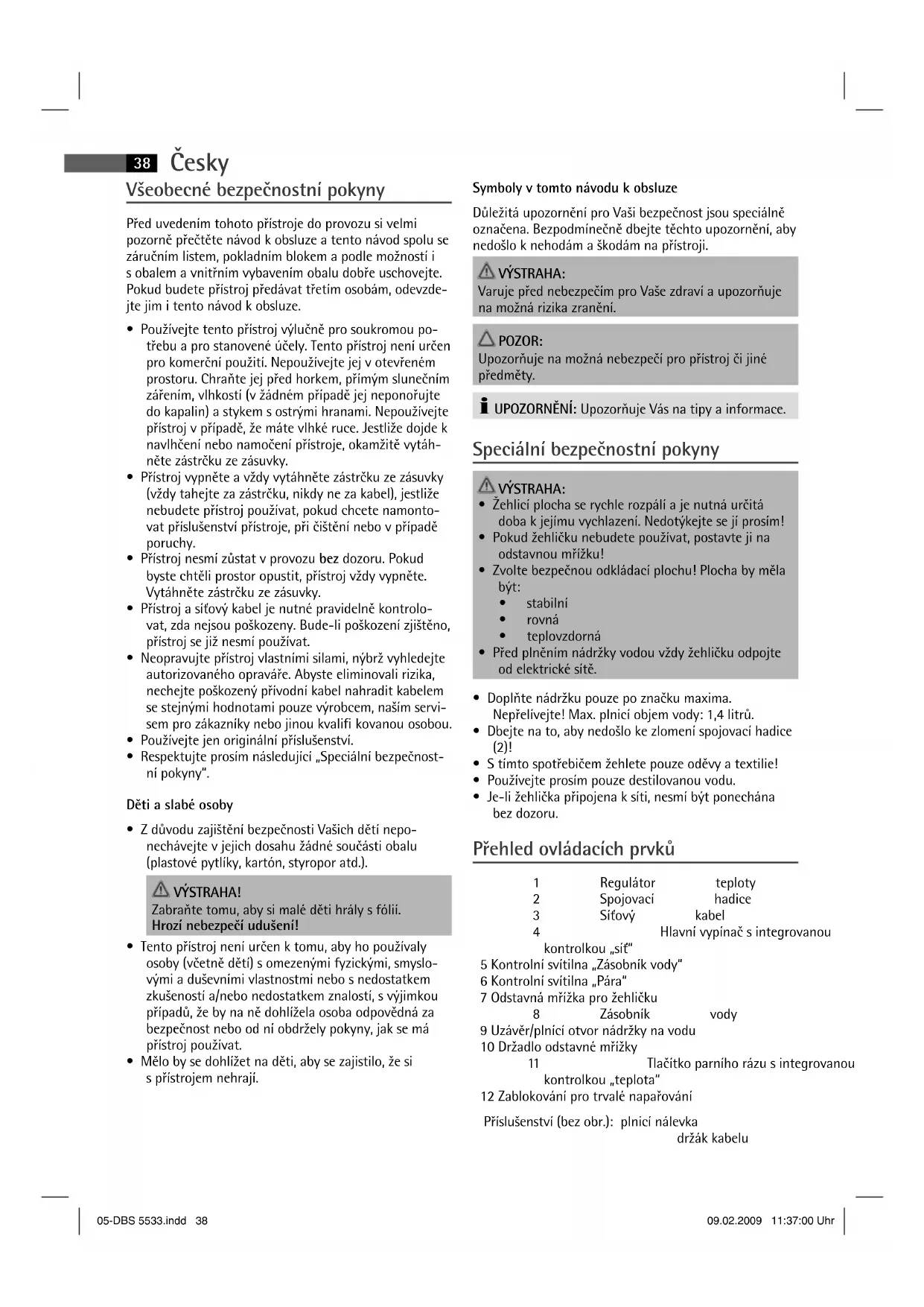- Je-li žehlička připojena k síti, nesmí být ponechána bez dozoru. Přehled ovládacích prvků 1 Regulátor teploty 2 Spojovací hadice 3 Síťový kabel 4 Hlavní vypínač s integrovanou kontrolkou „síť“ 5 Kontrolní svítilna „Zásobník vody“ 6 Kontrolní svítilna „Pára“ 7 Odstavná mřížka pro žehličku 8 Zásobník vody 9 Uzávěr/plnící otvor nádržky na vodu 10 Držadlo odstavné mřížky 11 Tlačítko parního rázu s integrovanou kontrolkou „teplota“ 12 Zablokování pro trvalé napařování Příslušenství (bez obr.): plnicí nálevka držák kabelu 05-DBS 5533.indd 3805-DBS 5533.indd 38 09.02.2009 11:37:00 Uhr09.02.2009 11:37:00 UhrČesky