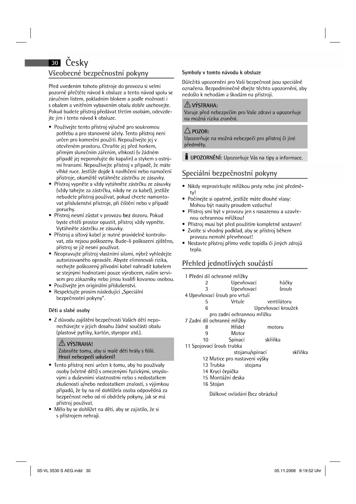 - Nestavte přístroj přímo vedle topidla či jiných zdrojů tepla. Přehled jednotlivých součástí 1 Přední díl ochranné mřížky 2 Upevňovací háčky 3 Upevňovací šroub 4 Upevňovací šroub pro vrtuli 5 Vrtule ventilátoru 6 Upevňovací kroužek pro zadní ochrannou mřížku 7 Zadní díl ochranné mřížky 8 Hřídel motoru 9 Motor 10 Spínací skříňka 11 Spojovací šroub trubka stojanu/spínací skříňka 12 Matice pro nastavení výšky 13 Trubka stojanu 14 Krycí čepička 15 Montážní deska 16 Stojan Dálkové ovládání (bez obrázku) 05-VL 5530 S AEG.indd 3005-VL 5530 S AEG.indd 30 05.11.2008 9:19:52 Uhr05.11.2008 9:19:52 UhrČesky