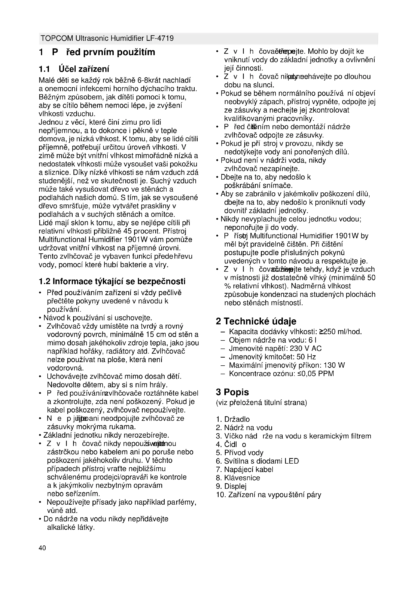 - Zvlhčovač nep oužívejte tehdy, když je vzduch v místnosti již dostatečně vlhký (minimálně 50 % relativní vlhkost). Nadměrná vlhkost způsobuje kondenzaci na studených plochách nebo stěnách místností. 2 Technické údaje – Kapacita dodávky vlhkosti: ≥250 ml/hod. – Objem nádrže na vodu: 6 l – Jmenovité napětí: 230 V AC – Jmenovitý kmitočet: 50 Hz – Maximální jmenovitý příkon: 130 W – Koncentrace ozónu: ≤0,05 PPM 3 Popis (viz přeložená titulní strana)