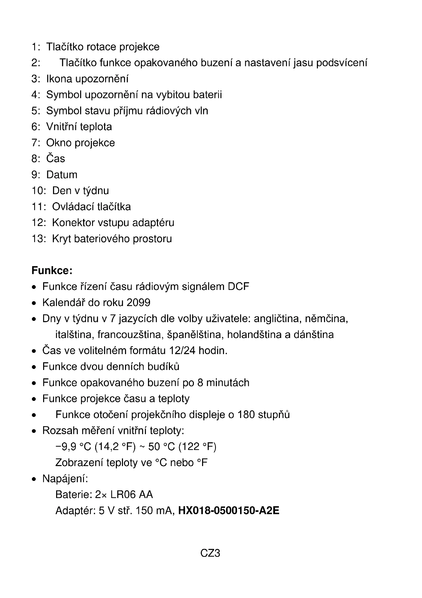 - Pri používání zdroje adaptéru budou podsvícení a projekce vždy zapnuté. Pomoci tlacítka „SNOOZE/LIGHT“ jas podsvícení upravíte nebo VYPNETE. Pořadi je: světly → střední → tmavý → VYPNUTO → světly → střední → tmavý......