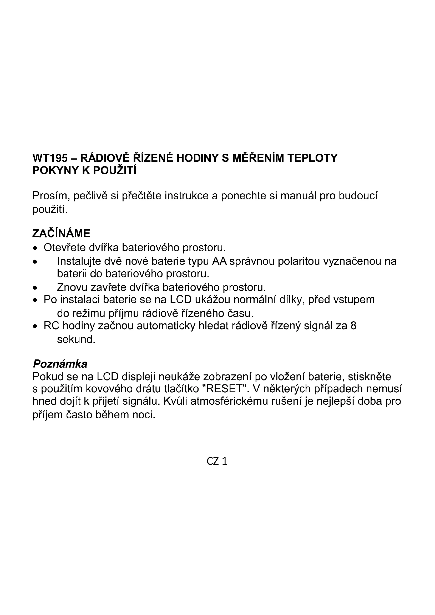 Pokud se na LCD displeoji neukáze zobrazení po vloženi baterie, stisknéte s použitím kovového drátu tlacítko "RESET". V některych pripadech nemusi hned dojít k prijetí signálu. Kvúli atmosféricému rušeni jenejlepsí doba pro prijem Často během noci.