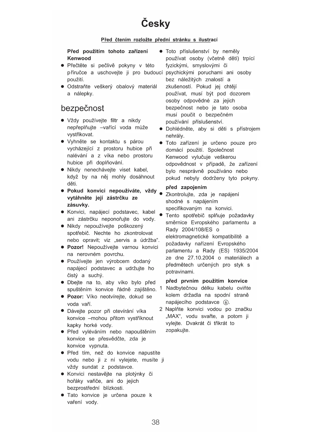 Tento spotřebič splňuje požadavky směrnice Evropského parlamentu a Rady 2004/108/ES o elektromagnetické kompatibilitě a požadavky nařízení Evropského parlamentu a Rady (ES) 1935/2004 ze dne 27.10.2004 o materiálech a předmětech určených pro styk s potravinami. před prvním použitím konvice 1 Nadbytečnou délku kabelu oviňte kolem držadla na spodní straně napájecího podstavce . 2 Naplňte konvici vodou po značku „MAX“, vodu svařte, a potom ji vylejte. Dvakrát ïi t¡ikrát to zopakujte.