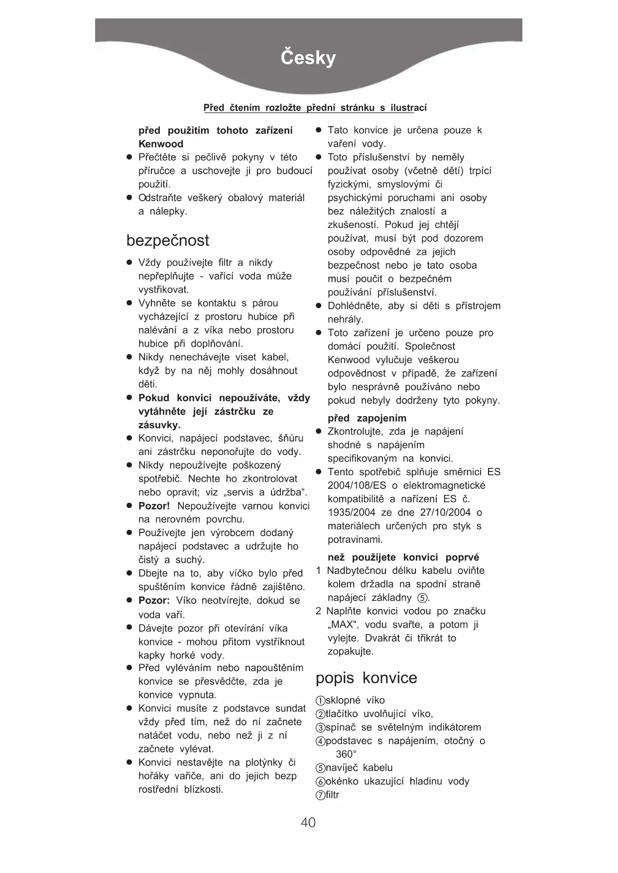 Tento spotřebič splňuje směrnici ES 2004/108/ES o elektromagnetické kompatibilitě a nařízení ES č. 1935/2004 ze dne 27/10/2004 o materiálech určených pro styk s potravinami. než použijete konvici poprvé 1 Nadbytečnou délku kabelu oviňte kolem držadla na spodní straně napájecí základny . 2 Naplňte konvici vodou po značku „MAX“, vodu svařte, a potom ji vylejte. Dvakrát ïi t¡ikrát to zopakujte. popis konvice sklopné víko tlačítko uvolňující víko, spínač se světelným indikátorem podstavec s napájením, otočný o 360° navíjeï kabelu okénko ukazující hladinu vody filtr