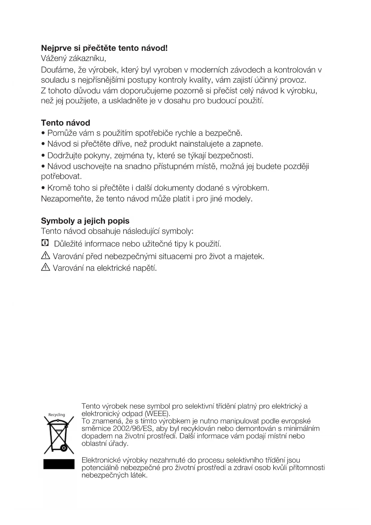 - Tento návod k použití předejte novému majiteli v případě prodeje výrobku.
