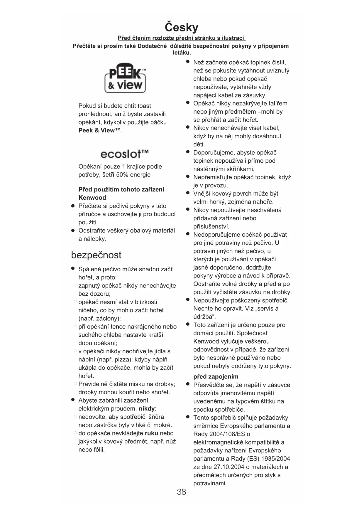 RADY 2002/96/ES Po ukončení doby provozní životnosti se tento výrobek nesmí likvidovat společně s domácím odpadem. Výrobek se musí odevzdat na specializovaném místě pro sběr tříděného odpadu, zřizovaném městskou správou anebo prodejcem, kde se tato služba poskytuje. Pomocí odděleného způsobu likvidace elektrospotřebičů se předchází vzniku negativních dopadů na životní prostředí a na zdraví, ke kterým by mohlo dojít v důsledku nevhodného nakládání s odpadem, a umožňuje se recyklace jednotlivých materiálů při dosažení významné úspory energií a surovin. Pro zdůraznění povinnosti tříděného sběru odpadu elektrospotřebičů je výrobek označený symbolem přeškrtnutého odpadkového koše. 40A Peek & View™ kar segítségével bármikor kiemelheti a kenyérszeletet, anélkül hogy a pirítási folyamatot megszakítaná. 1 nyílás beállítása – csak azt melegíti, amit kell, 50% energiát megtakarít. a Kenwood-készülék használata előtt
