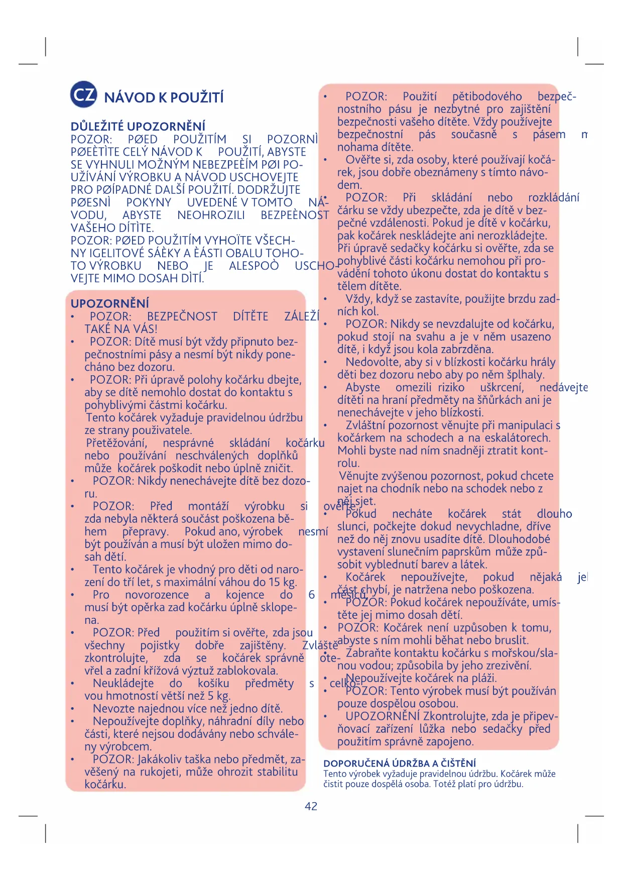 - POZOR:Přiúpravěpolohykočárkudbejte, abysedítěnemohlodostatdokontaktus pohyblivýmičástmikočárku. Tentokočárekvyžadujepravidelnouúdržbu zestranypouživatele. Přetěžování, nesprávné skládání kočárku nebo používání neschválených doplňků můžekočárekpoškoditneboúplnězničit.
