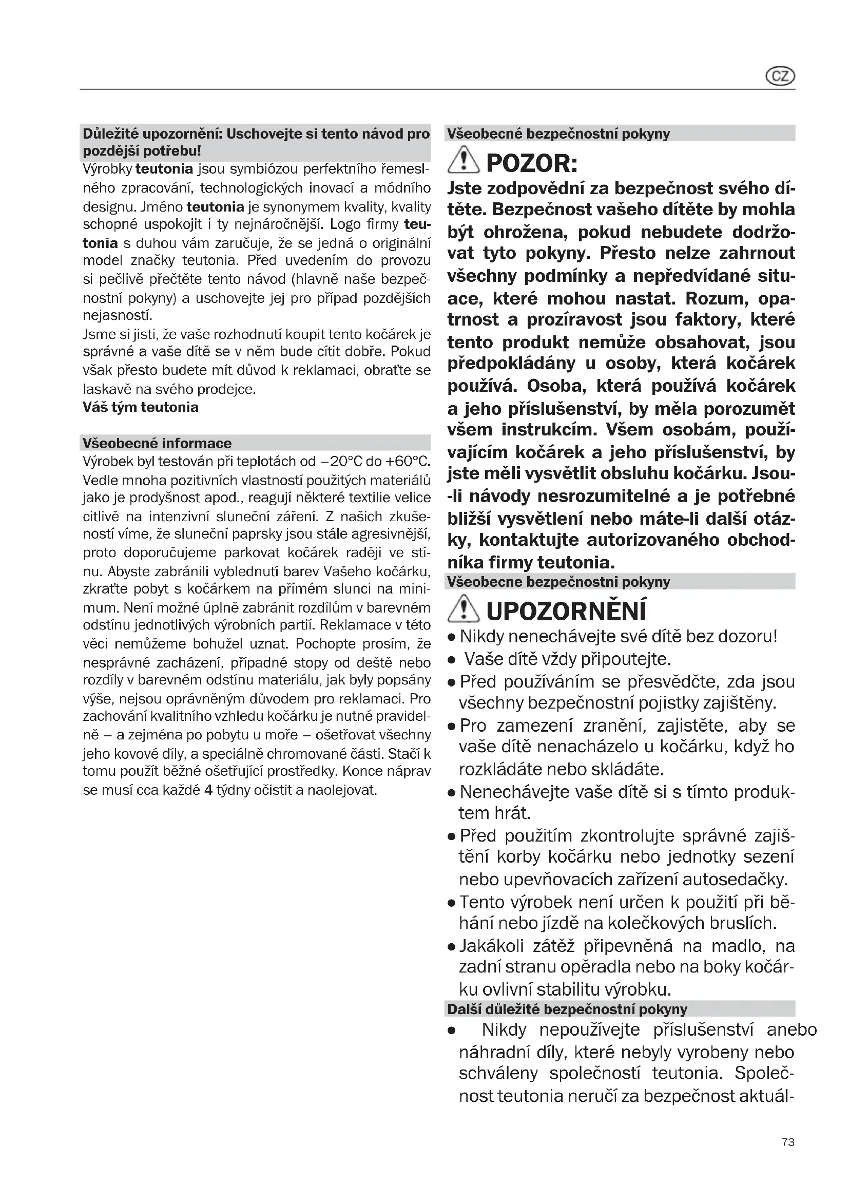 Jste zodpovedni za bezpečnost svého ditěte. Bezpečnost vaseho ditěte by mohla BYt ohrožena,Pokud nebudete dodržovat tyto Pokyny.Presto nelze zahrnout vsechny podminky a nepredvidané situace, které mohou nastat.Rozum, opatrnost a proziravost jsou faktory, které tento produkt nemuže obsahovat, jsou prédpokládány u osoby, ktera koçárek používa.Osoba,která používa koçárek a jeho prislušenstvi,by mela porozumet vsem instrukcím.Vsem osobám,používajćim koçárek a jeho prislušenstvi,by jste meli vysvětlit obsluhu kočárku.Jsou-li návody nosrozumitelné a je potrebné blizsīvysvětleni nebo mate-li dalsi otázky,kontaktujte autorizovaného obchodnika firmy teutonia.