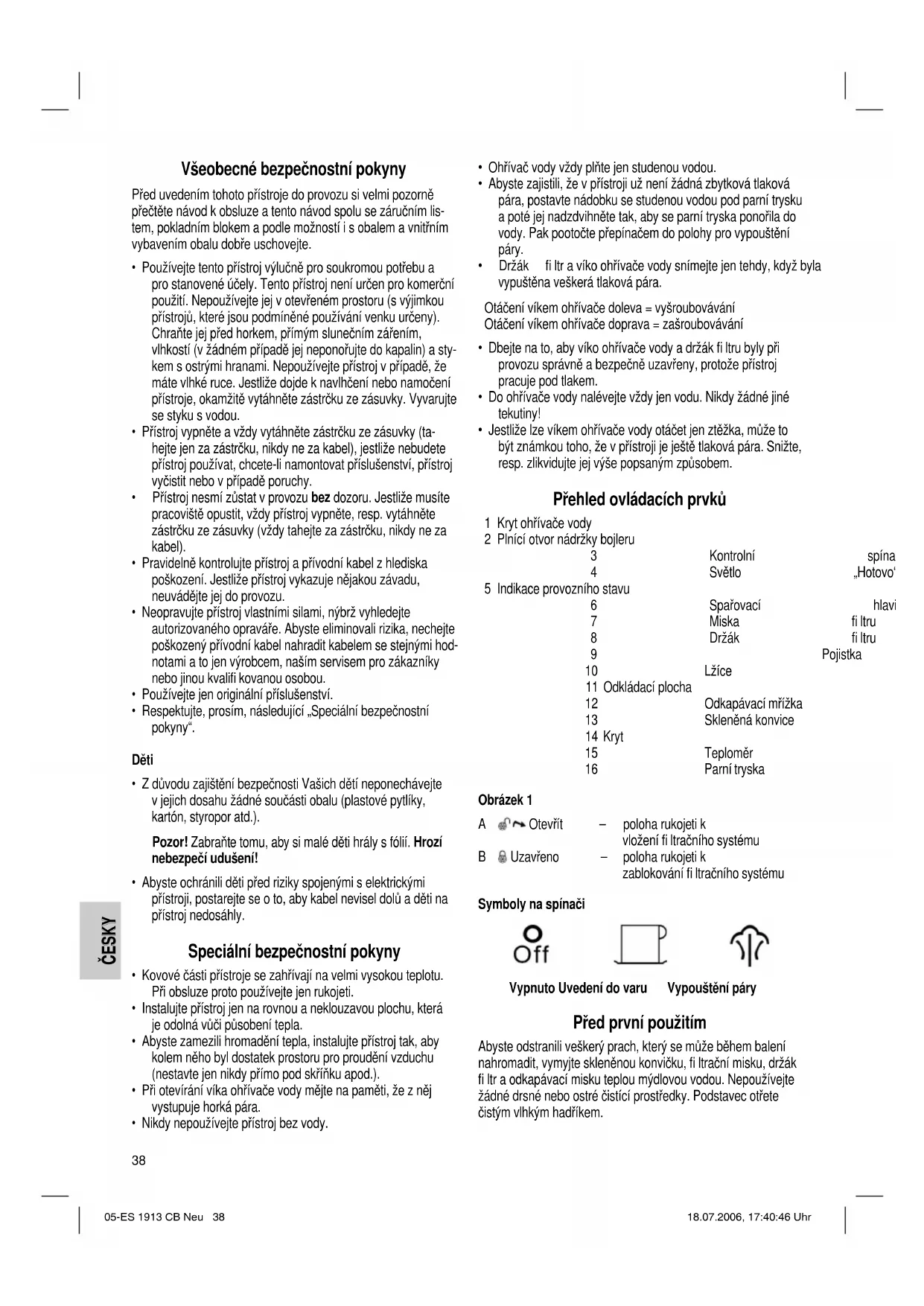 - Jestliže lze víkem ohřívače vody otáčet jen ztěžka, může to být známkou toho, že v přístroji je ještě tlaková pára. Snižte, resp. zlikvidujte jej výše popsaným způsobem. Přehled ovládacích prvků 1 Kryt ohřívače vody 2 Plnící otvor nádržky bojleru 3 Kontrolní spínač 4 Světlo „Hotovo“ 5 Indikace provozního stavu 6 Spařovací hlavice 7 Miska fi ltru 8 Držák fi ltru 9 Pojistka fi ltru 10 Lžíce 11 Odkládací plocha 12 Odkapávací mřížka 13 Skleněná konvice 14 Kryt 15 Teploměr 16 Parní tryska Obrázek 1 A Otevřít – poloha rukojeti k vložení fi ltračního systému B Uzavřeno – poloha rukojeti k zablokování fi ltračního systému Symboly na spínači Vypnuto Uvedení do varu Vypouštění páry Před první použitím Abyste odstranili veškerý prach, který se může během balení nahromadit, vymyjte skleněnou konvičku, fi ltrační misku, držák fi ltr a odkapávací misku teplou mýdlovou vodou. Nepoužívejte žádné drsné nebo ostré čistící prostředky. Podstavec otřete čistým vlhkým hadříkem. 05-ES 1913 CB Neu 38 18.07.2006, 17:40:46 UhrČESKY