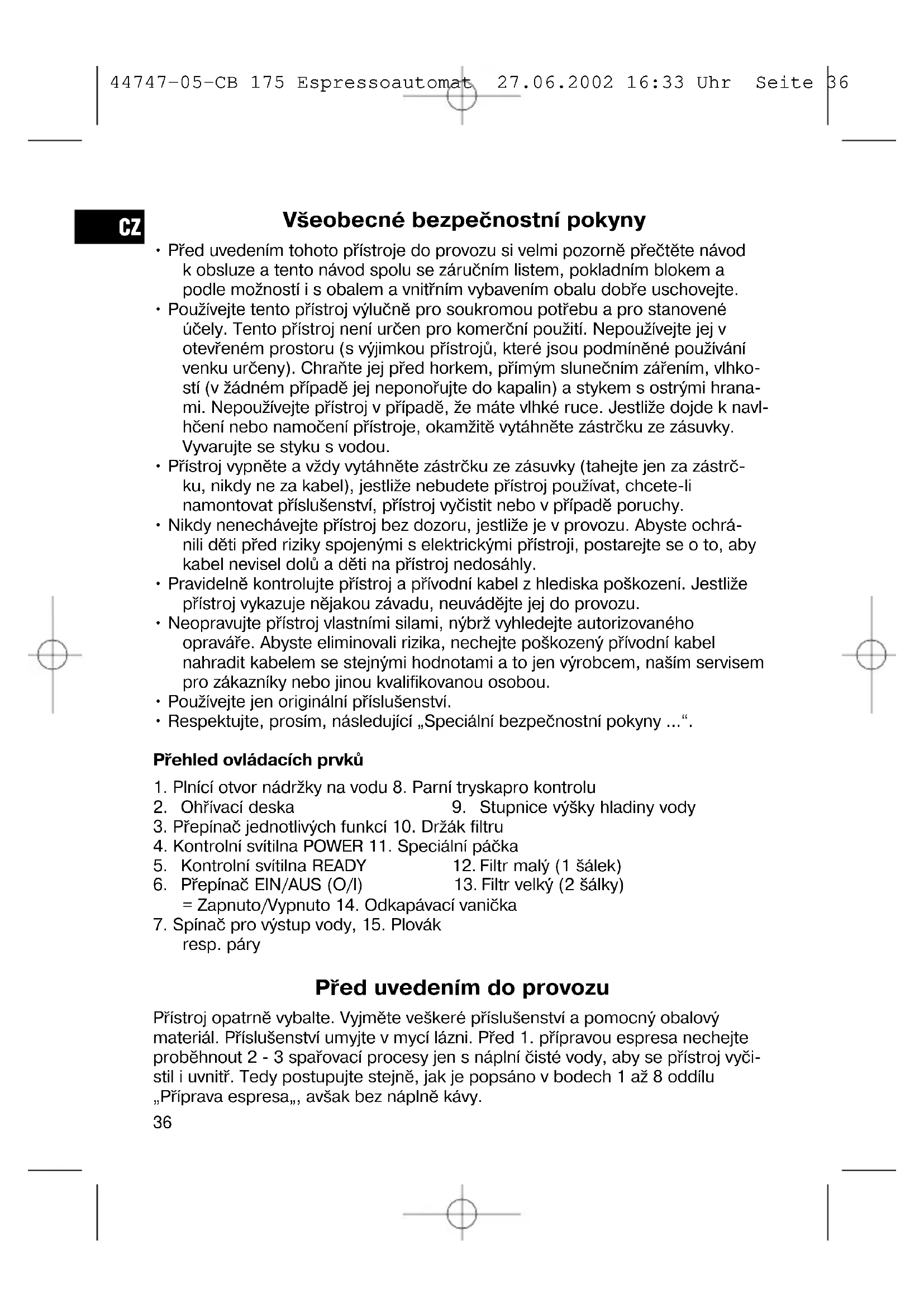 resp. páry Před uvedením do provozu Přístroj opatrně vybalte. Vyjměte veškeré příslušenství a pomocný obalový materiál. Příslušenství umyjte v mycí lázni. Před 1. přípravou espresa nechejte proběhnout 2 - 3 spařovací procesy jen s náplní čisté vody, aby se přístroj vyči- stil i uvnitř. Tedy postupujte stejně, jak je popsáno v bodech 1 až 8 oddílu „Příprava espresa„, avšak bez náplně kávy. 44747-05-CB 175 Espressoautomat 27.06.2002 16:33 Uhr Seite 36Příprava espresa