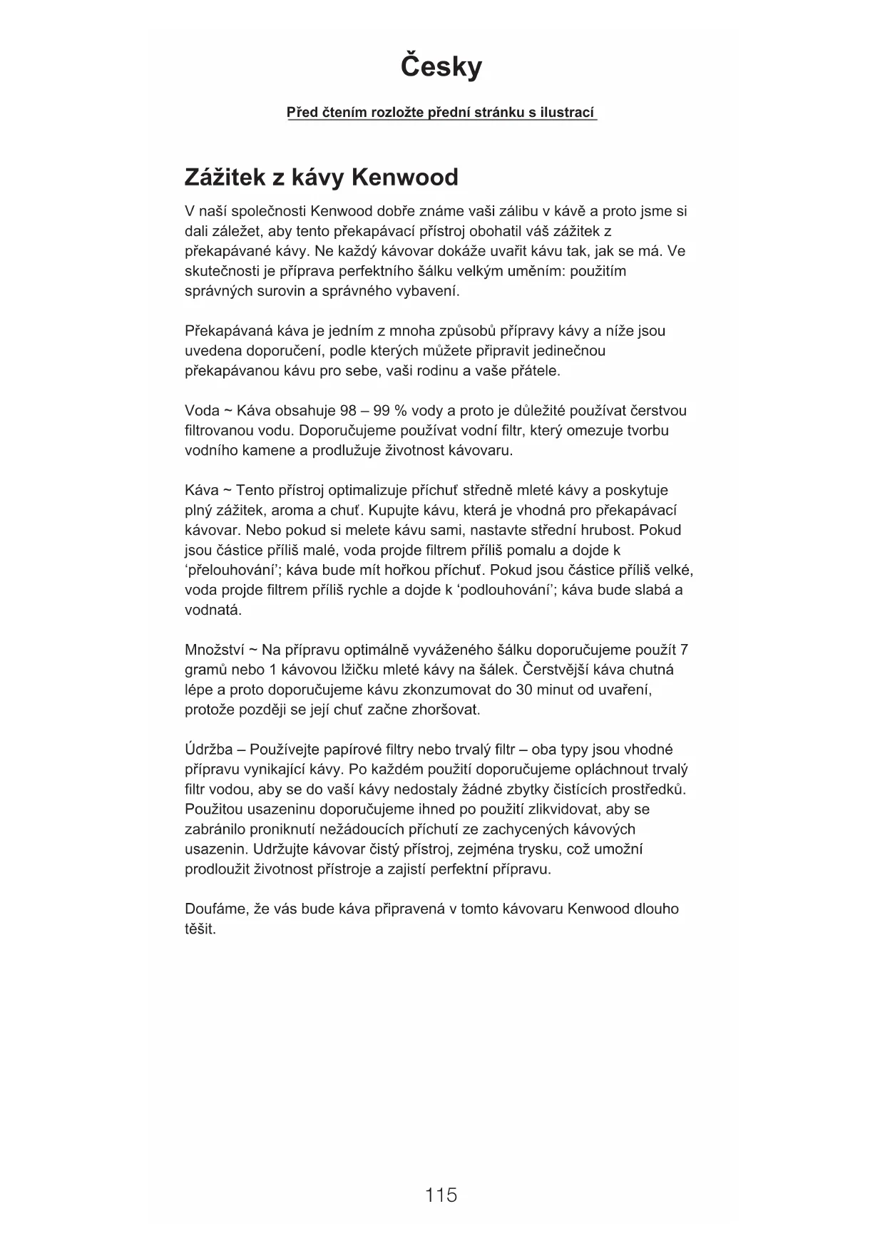 naší společnosti Kenwood dobře známe vaši zálibu v kávě a proto jsme si dali záležet, aby tento překapávací přístroj obohatil váš zážitek z překapávané kávy. Ne každý kávovar dokáže uvařit kávu tak, jak se má. Ve skutečnosti je příprava perfektního šálku velkým uměním: použitím správných surovin a správného vybavení. Překapávaná káva je jedním z mnoha způsobů přípravy kávy a níže jsou uvedena doporučení, podle kterých můžete připravit jedinečnou překapávanou kávu pro sebe, vaši rodinu a vaše přátele. Voda ~ Káva obsahuje 98 – 99 % vody a proto je důležité používat čerstvou filtrovanou vodu. Doporučujeme používat vodní filtr, který omezuje tvorbu vodního kamene a prodlužuje životnost kávovaru. Káva ~ Tento přístroj optimalizuje příchuť středně mleté kávy a poskytuje plný zážitek, aroma a chuť. Kupujte kávu, která je vhodná pro překapávací kávovar. Nebo pokud si melete kávu sami, nastavte střední hrubost. Pokud jsou částice příliš malé, voda projde filtrem příliš pomalu a dojde k ‘přelouhování’; káva bude mít hořkou příchuť. Pokud jsou částice příliš velké, voda projde filtrem příliš rychle a dojde k ‘podlouhování’; káva bude slabá a vodnatá. Množství ~ Na přípravu optimálně vyváženého šálku doporučujeme použít 7 gramů nebo 1 kávovou lžičku mleté kávy na šálek. Čerstvější káva chutná lépe a proto doporučujeme kávu zkonzumovat do 30 minut od uvaření, protože později se její chuť začne zhoršovat. Údržba – Používejte papírové filtry nebo trvalý filtr – oba typy jsou vhodné přípravu vynikající kávy. Po každém použití doporučujeme opláchnout trvalý filtr vodou, aby se do vaší kávy nedostaly žádné zbytky čistících prostředků. Použitou usazeninu doporučujeme ihned po použití zlikvidovat, aby se zabránilo proniknutí nežádoucích příchutí ze zachycených kávových usazenin. Udržujte kávovar čistý přístroj, zejména trysku, což umožní prodloužit životnost přístroje a zajistí perfektní přípravu. Doufáme, že vás bude káva připravená v tomto kávovaru Kenwood dlouho těšit.