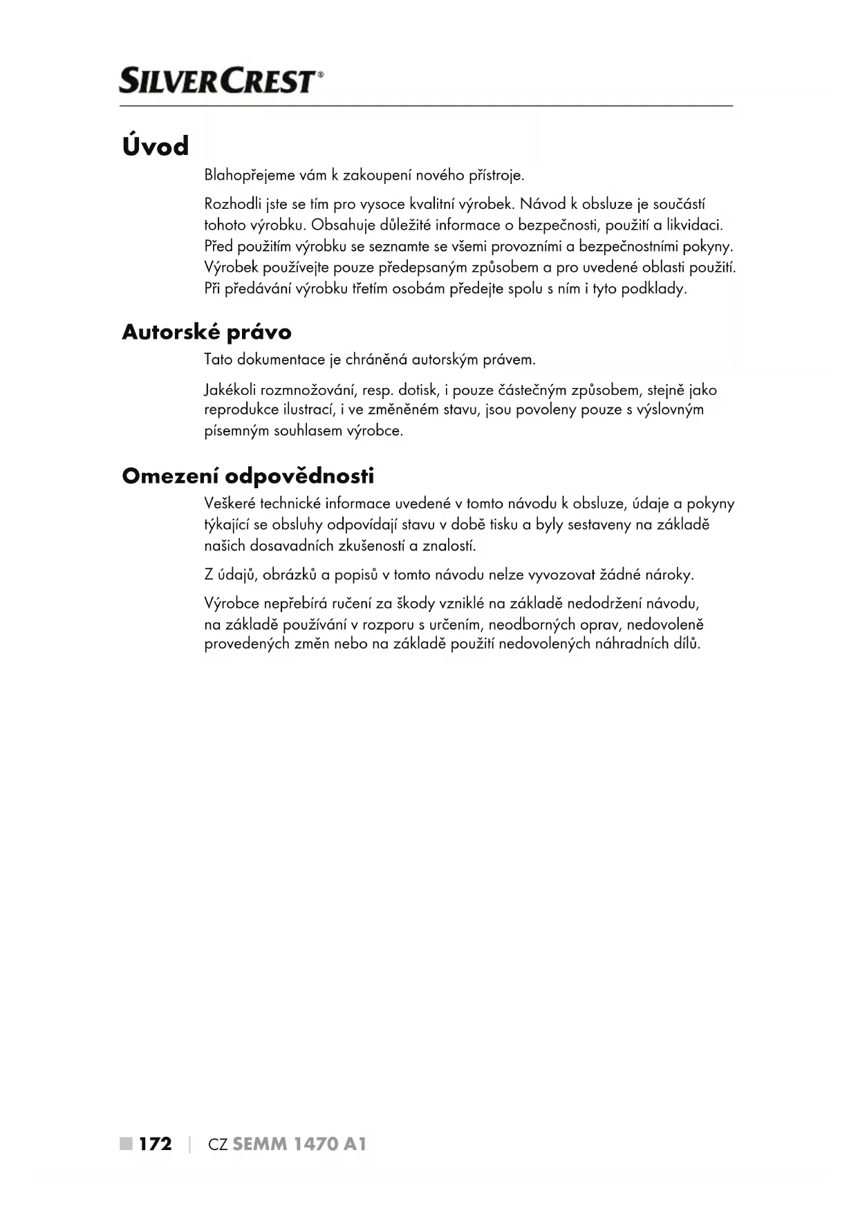 Úvod Blahopřejeme vám kzakoupení nového přístroje. Rozhodli jste se tím pro vysoce kvalitní výrobek. Návod kobsluze je součástí tohoto výrobku. Obsahuje důležité informace obezpečnosti, použití a likvidaci. Před použitím výrobku se seznamte se všemi provozními a bezpečnostními pokyny. Výrobek používejte pouze předepsaným způsobem a pro uvedené oblasti použití. Při předávání výrobku třetím osobám předejte spolu sním ityto podklady. Autorské právo Tato dokumentace je chráněná autorským právem. Jakékoli rozmnožování, resp. dotisk, i pouze částečným způsobem, stejně jako reprodukce ilustrací, i ve změněném stavu, jsou povoleny pouze svýslovným písemným souhlasem výrobce. Omezení odpovědnosti Veškeré technické informace uvedené vtomto návodu kobsluze, údaje a pokyny týkající se obsluhy odpovídají stavu vdobě tisku a byly sestaveny na základě našich dosavadních zkušeností a znalostí. Zúdajů, obrázků a popisů vtomto návodu nelze vyvozovat žádné nároky. Výrobce nepřebírá ručení za škody vzniklé na základě nedodržení návodu, na základě používání vrozporu surčením, neodborných oprav, nedovoleně provedených změn nebo na základě použití nedovolených náhradních dílů.CZ