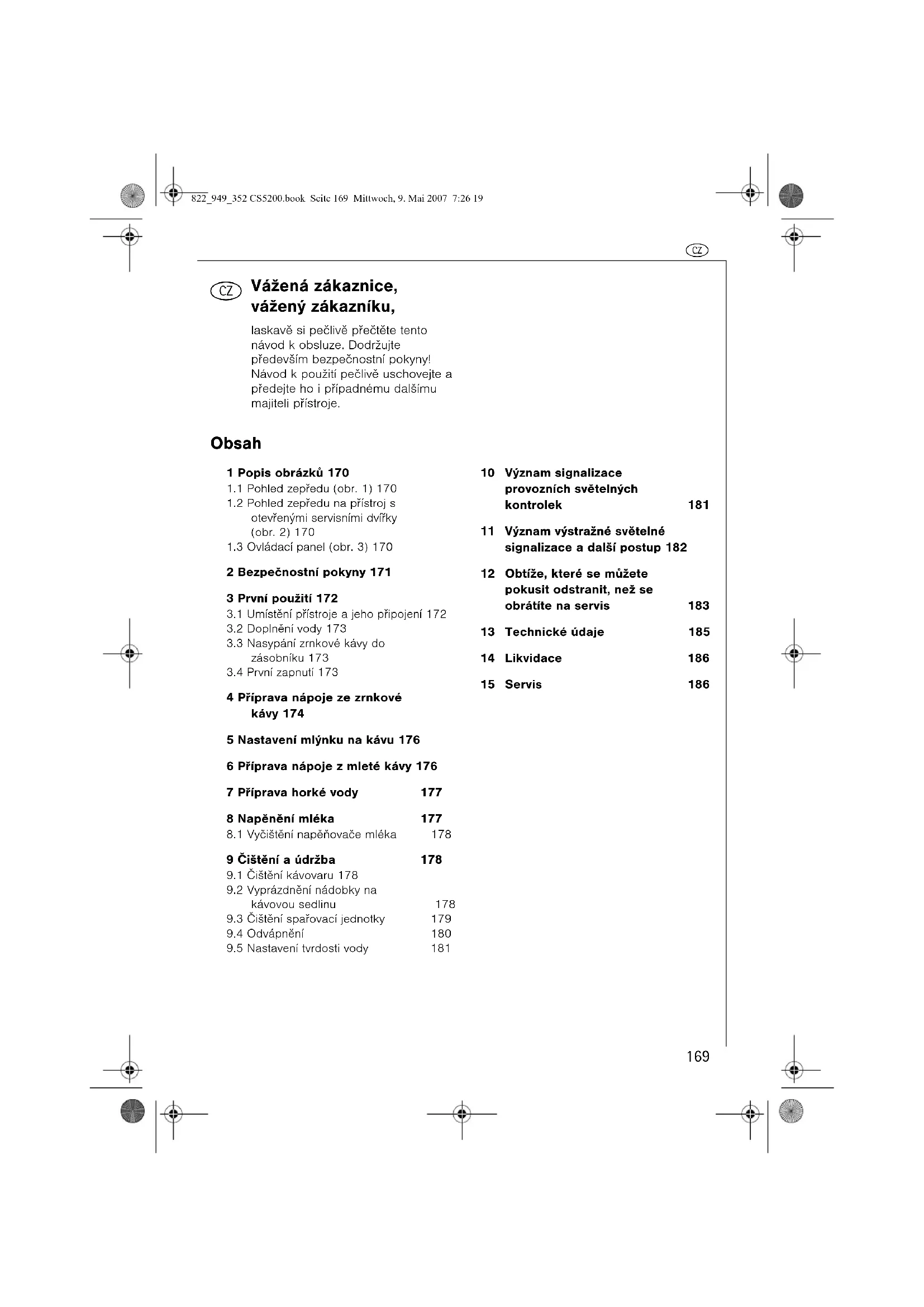 9 Èištìní a údržba 178 9.1 Èištìní kávovaru 1789.2 Vyprázdnìní nádobky na kávovou sedlinu 1789.3 Èištìní spaøovací jednotky 1799.4 Odvápnìní 1809.5 Nastavení tvrdosti vody 181 10 Význam signalizace provozních svìtelných kontrolek 181 11 Význam výstražné svìtelné signalizace a další postup 182 12 Obtíže, které se mùžete pokusit odstranit, než se obrátíte na servis 183 13 Technické údaje 185 14 Likvidace 186 15 Servis 186 822_949_352 CS5200.book Seite 169 Mittwoch, 9. Mai 2007 7:26 19c