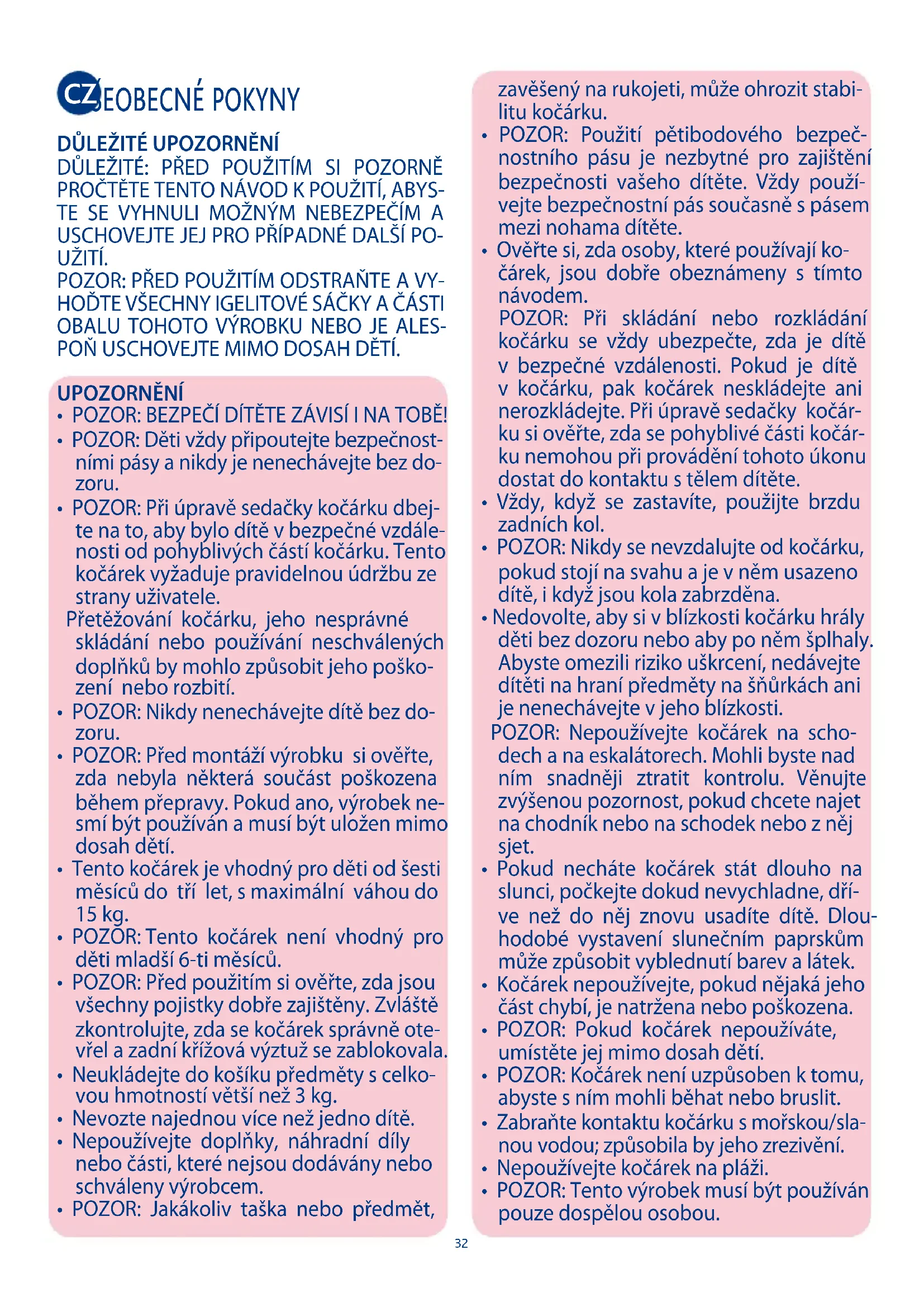 - POZOR: Při úpravě sedačky kočárku dbej- te na to, aby bylo dítě vbezpečné vzdále- nosti od pohyblivých částí kočárku. Tento kočárek vyžaduje pravidelnou údržbu ze strany uživatele. Přetěžování kočárku, jeho nesprávné skládání nebo používání neschválených doplňků by mohlo způsobit jeho poško- zení nebo rozbití.