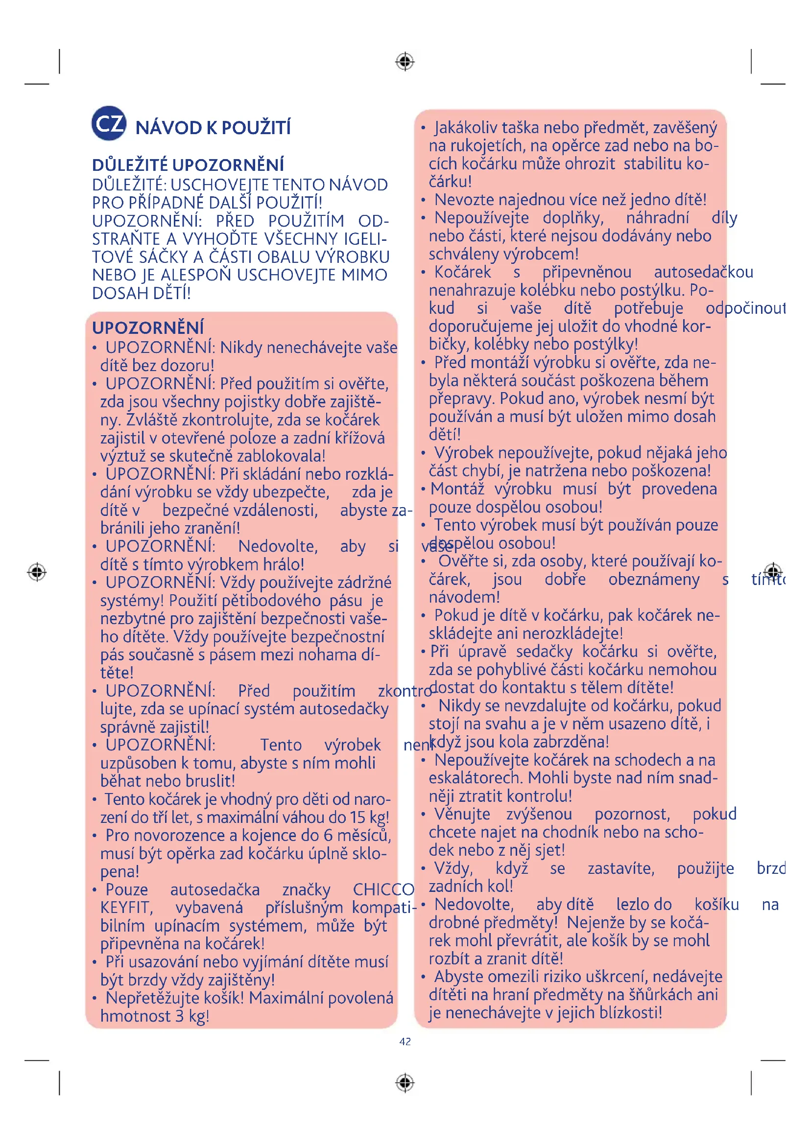 - UPOZORNĚNÍ:Předpoužitímsiověřte, zdajsouvšechnypojistkydobřezajiště- ny.Zvláštězkontrolujte,zdasekočárek zajistilvotevřenépolozeazadníkřížová výztužseskutečnězablokovala!