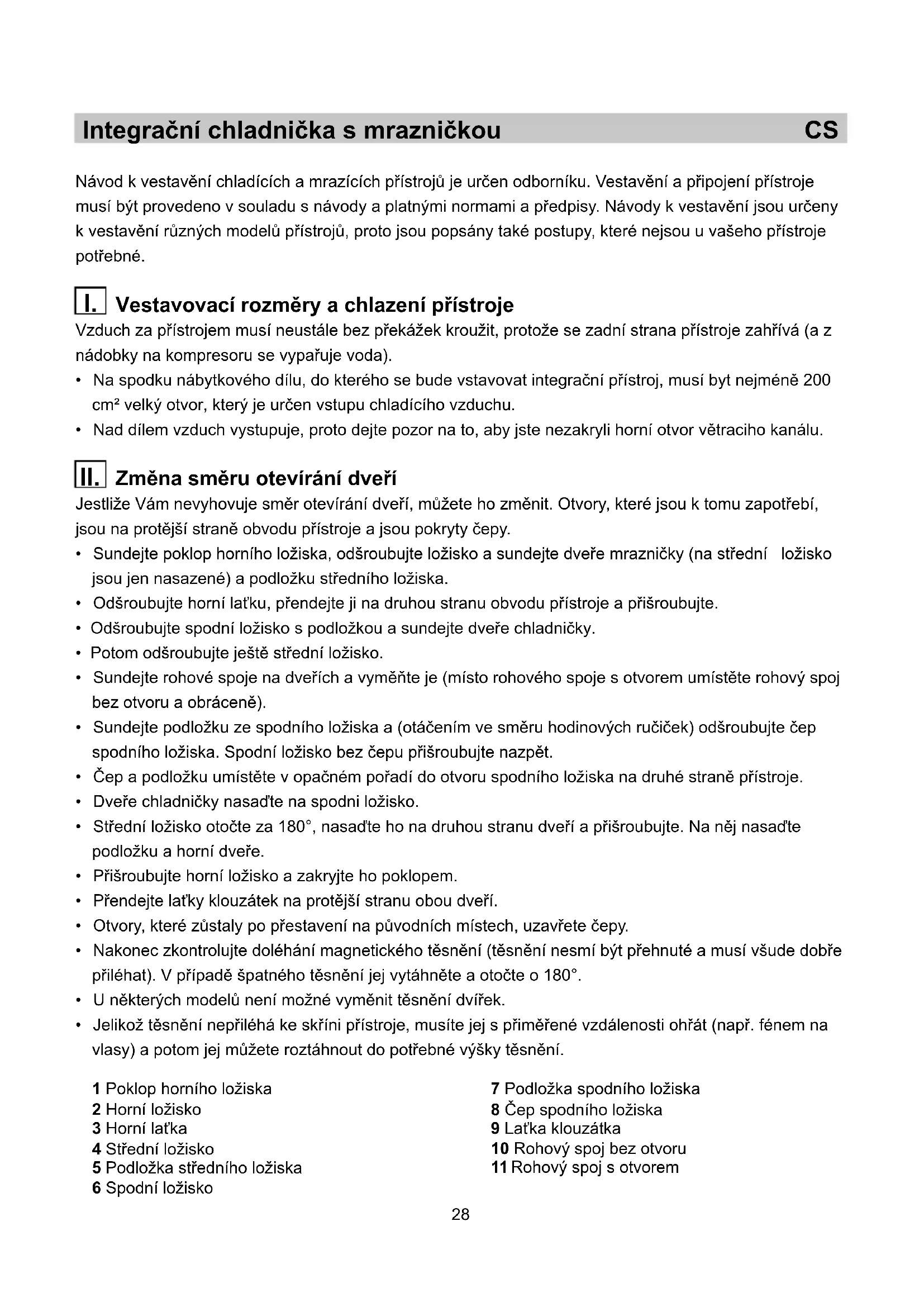 - Nad dílem vzduch vystupuje, proto dejte pozor na to, aby jste nezakryli horní otvor větraciho kanálu. Změna směru otevírání dveří Jestliže Vám nevyhovuje směr otevírání dveří, můžete ho změnit. Otvory, které jsou k tomu zapotřebí, jsou na protější straně obvodu přístroje a jsou pokryty čepy.