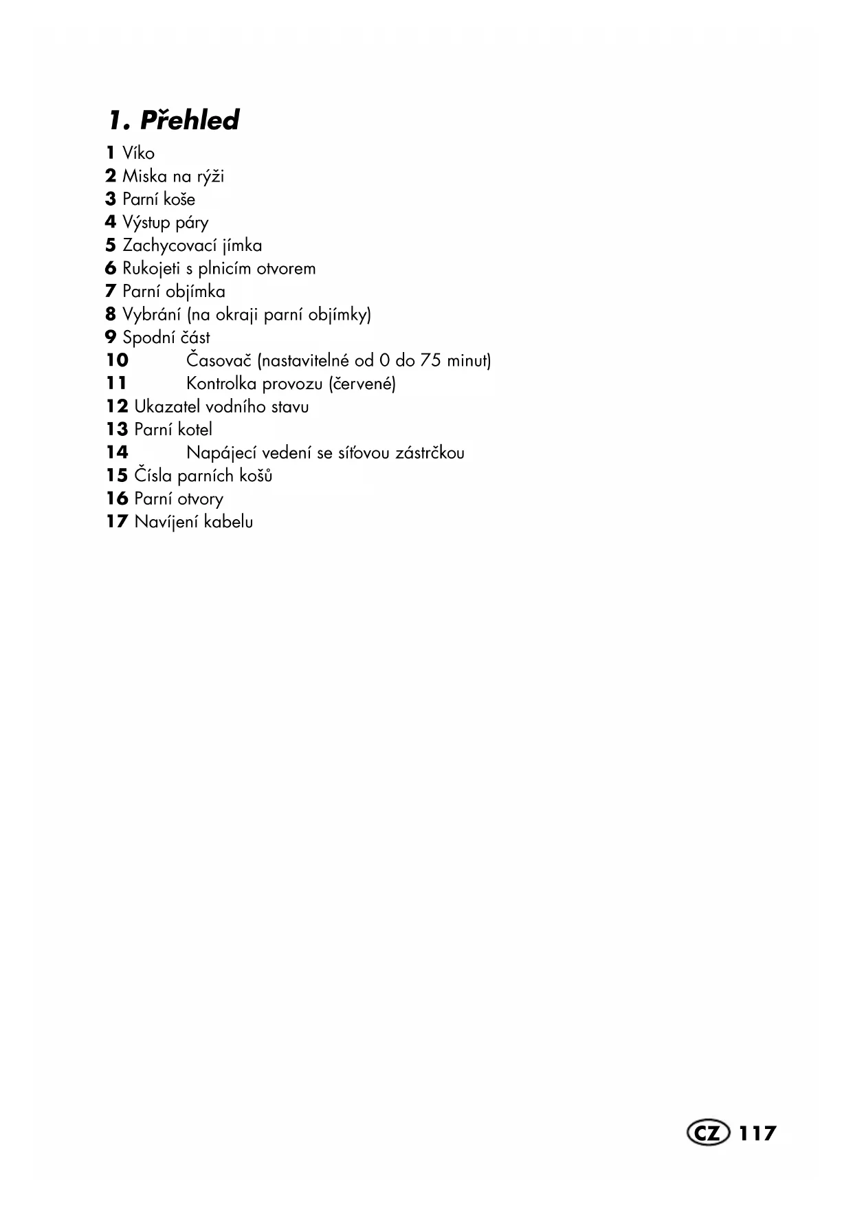 1 Víko 2 Miska na rýži 3 Parní koše 4 Výstup páry 5 Zachycovací jímka 6 Rukojeti s plnicím otvorem 7 Parní objímka 8 Vybrání (na okraji parní objímky) 9 Spodní část 10 Časovač (nastavitelné od 0 do 75 minut) 11 Kontrolka provozu (červené) 12 Ukazatel vodního stavu 13 Parní kotel 14 Napájecí vedení se síťovou zástrčkou 15 Čísla parních košů 16 Parní otvory 17 Navíjení kabelu __340677_2004_Dampfgarer_B8.book Seite 117 Montag, 22. Juni 2020 1:29 13118