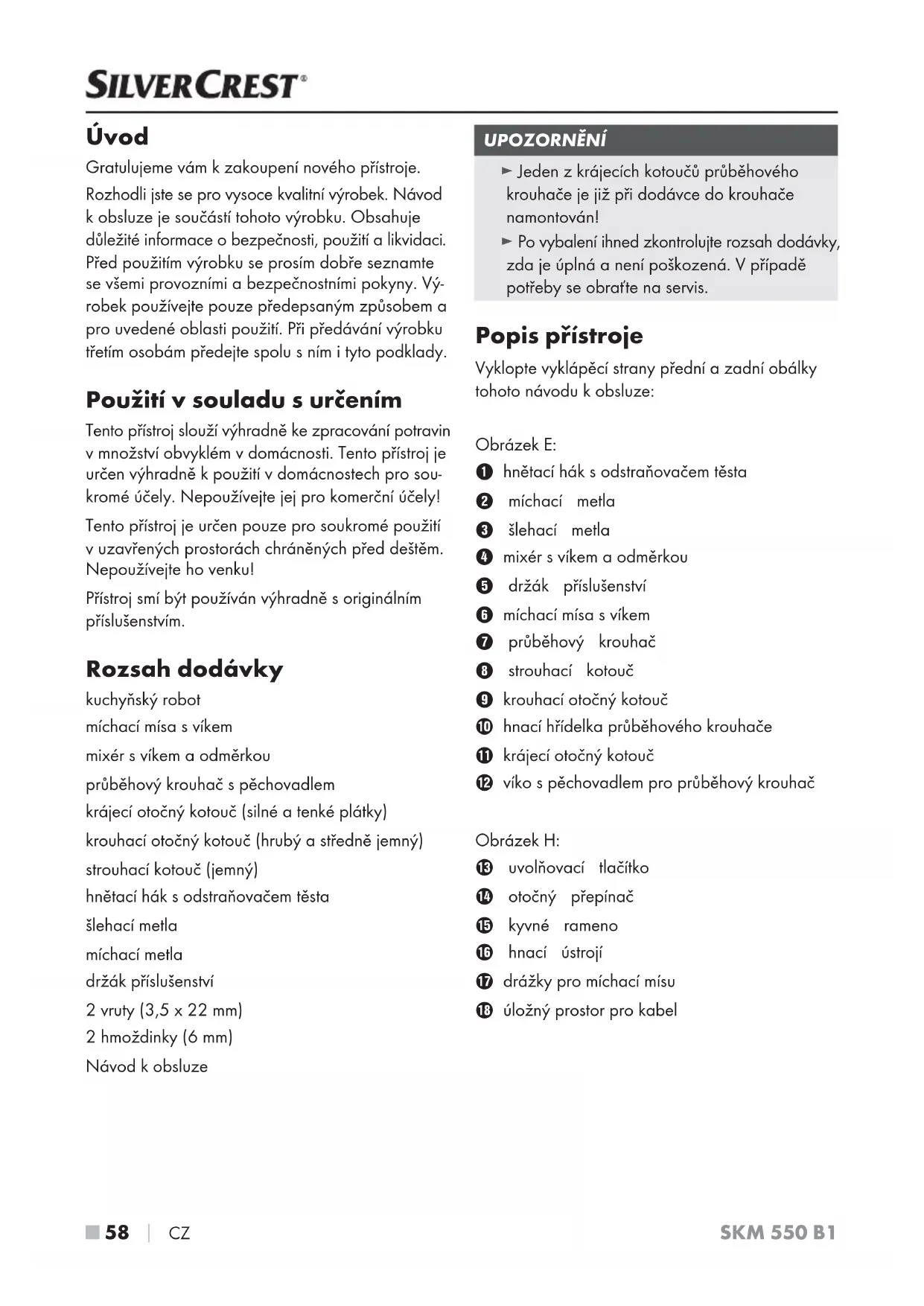CZ SKM 550 B1 Úvod Gratulujeme vám kzakoupení nového přístroje. Rozhodli jste se pro vysoce kvalitní výrobek. Návod kobsluze je součástí tohoto výrobku. Obsahuje důležité informace obezpečnosti, použití a likvidaci