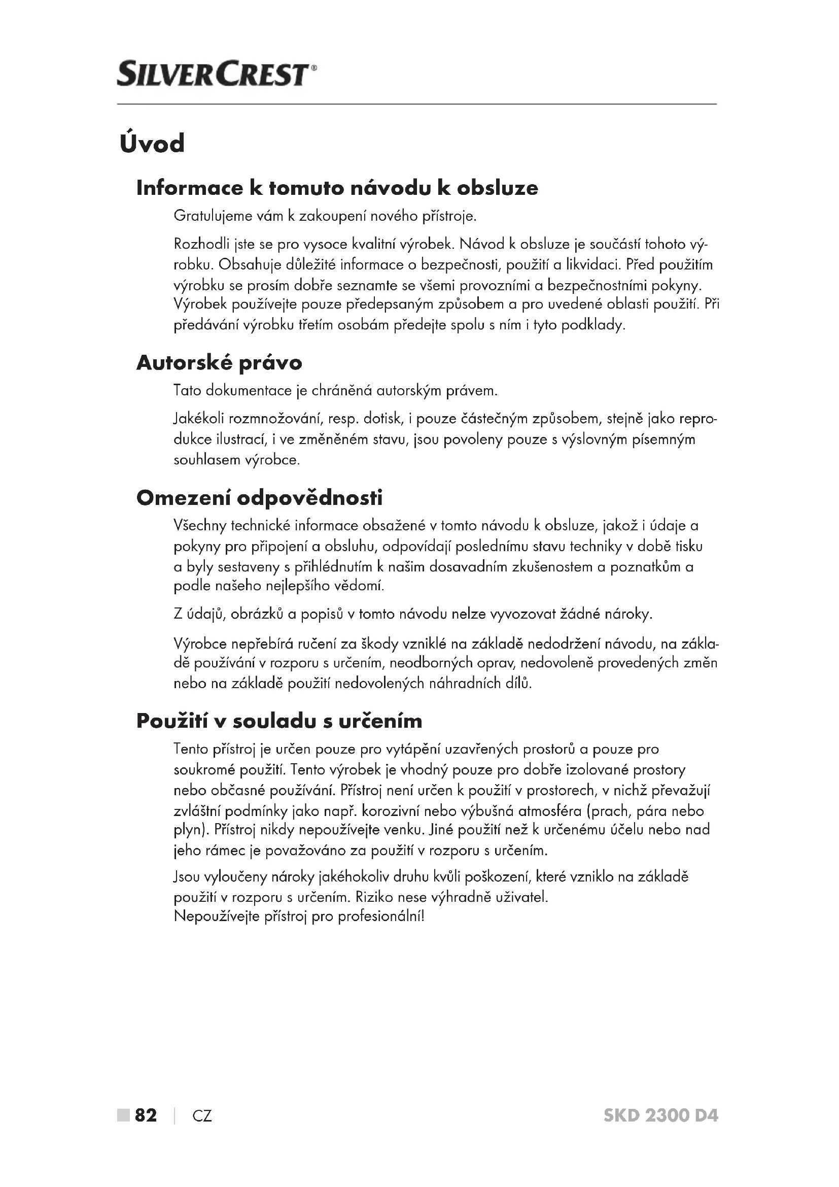 CZ SKD 2300 D4 Záruka společnosti Kompernass Handels GmbH Vážená zákaznice, vážený zákazníku, na tento přístroj získáváte záruku v trvání 3let od data zakoupení. V případě závad tohoto výrobku máte zákonná práva vůči prodejci výrobku. Tato zákonná práva nejsou omezena naší níže uvedenou zárukou. Záruční podmínky Záruční doba začíná plynout dnem nákupu. Dobře uschovejte originál pokladního lístku. Tento doklad je potřebný jako důkaz o koupi. Pokud do tří let od data zakoupení tohoto výrobku dojde k vadě materiálu nebo vý robní závadě, pak Vám podle našeho uvážení výrobek zdarma opravíme nebo vyměníme. Předpokladem této záruky je, že bude během tříleté lhůty předložen vad- ný přístroj a doklad o koupi (pokladní lístek) a stručně se popíše v čem závada spočívá a kdy se vyskytla. Vztahuje-li se na závadu naše záruka, obdržíte zpět buď opravený nebo nový pro- dukt. Opravou nebo výměnou výrobku nezačne plynout nová záruční doba. Záruční doba a zákonné nároky vyplývající ze závad Záručním plněním se záruční doba neprodlužuje. To platí ipro vyměněné a opravené součásti. Poškození nebo vady vyskytující se případně již při nákupu se musí oznámit ihned po vybalení. Po uplynutí záruční doby podléhají veškeré opravy zpoplatnění. Rozsah záruky Přístroj byl vyroben pečlivě podle přísných směrnic kvality a před expedicí byl svědo- mitě vyzkoušen. Záruka se vztahuje na materiálové nebo výrobní vady. Tato záruka se nevztahuje na součásti produktu, které jsou vystaveny normálnímu opotřebení, a proto je lze pova- žovat za opotřebovatelné díly nebo za poškození křehkých součástí jako jsou např. spínače, akumulátory, formy na pečení nebo části, které jsou vyrobeny ze skla. Tato záruka zaniká, pokud je výrobek poškozen, nebyl řádně používán nebo udržo- ván. Pro zajištění správného používání výrobku se musí přesně dodržovat všechny pokyny uvedené v návodu kobsluze. Účelům použití a úkonům, které se v návodu kobsluze nedoporučují nebo se před nimi varuje, je třeba se bezpodmínečně vyhnout. Výrobek je určen pouze pro soukromé účely a ne pro komerční použití. Při nesprávném a neodborném používání, při použití násilí a při zásazích, které nebyly provedeny našimi autorizovanými servisními provozovnami, záruční nároky zanikají.CZ